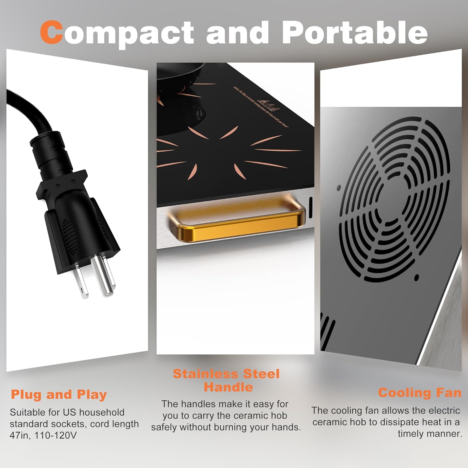 - 【Compatible for All Types of Pans】Cooksir 120v electric stove top with plug is suitable for any material of cookwares, such as aluminium pans, copper pans, cast iron frying pans and non-magnetic stainless steel pans. Please make sure that the bottom of the pans used should be flat with diameter from 4.72" to 9.45". Product Size: 22.2" L x 13.1"W x 1.97“H.