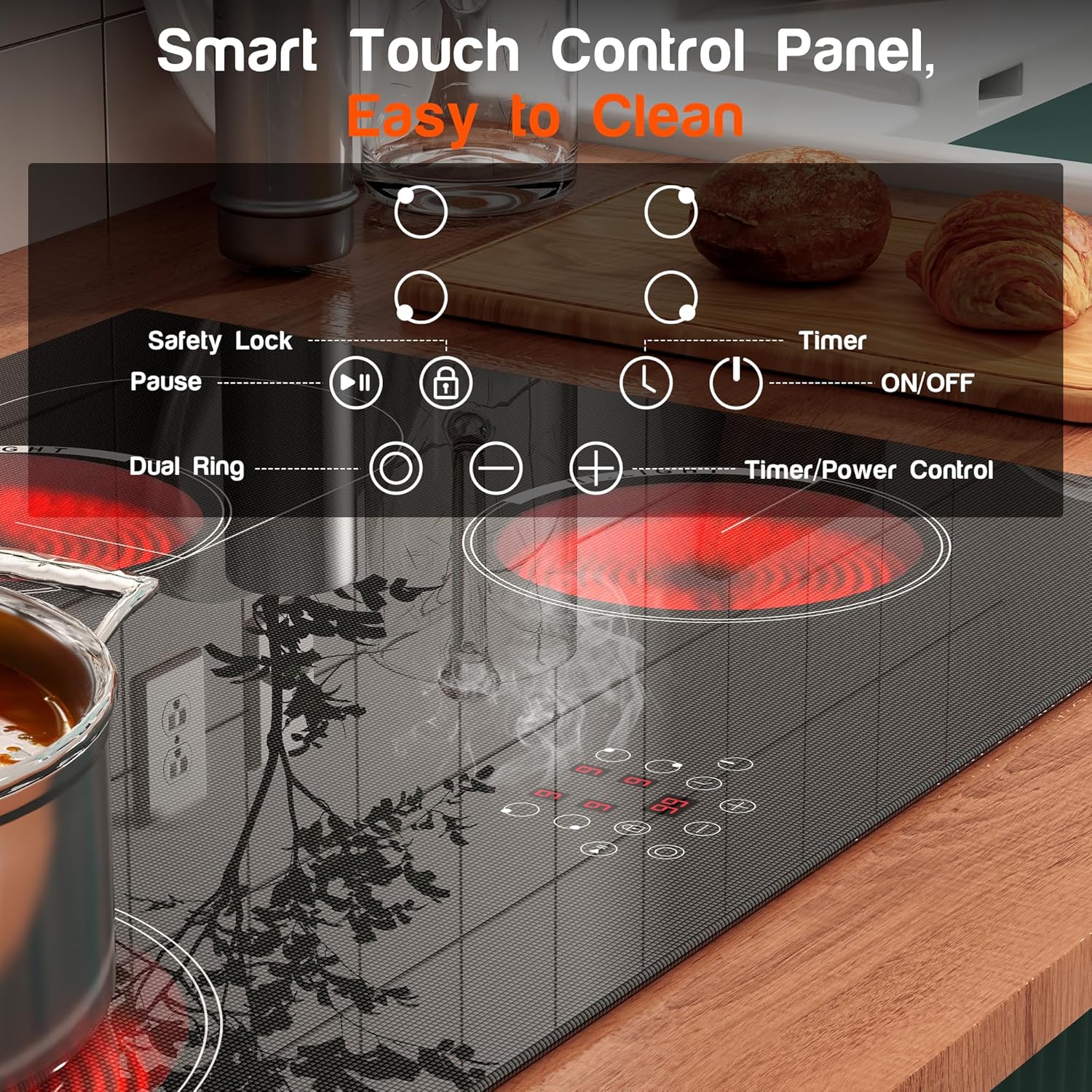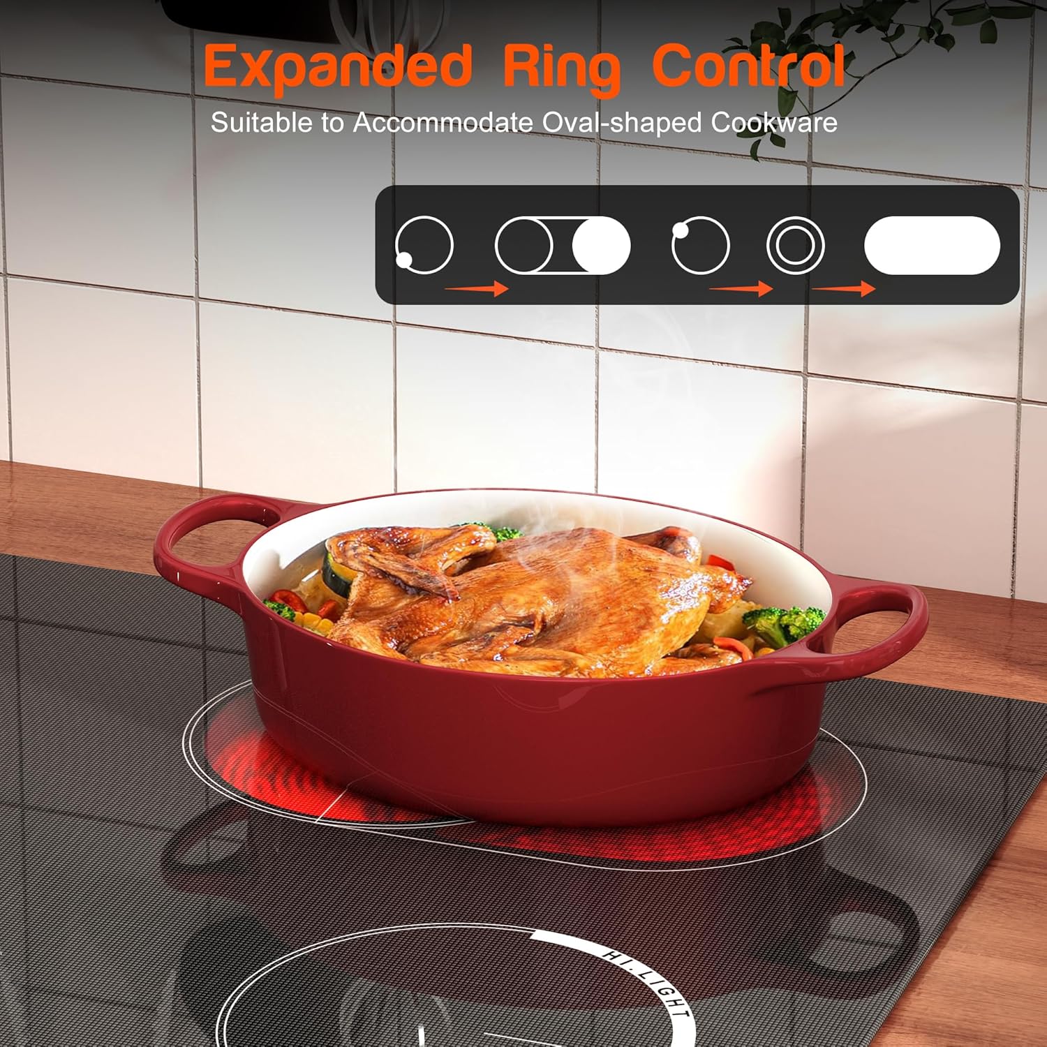 - 【Dynamic Expanded Zones】 Among the standout features of this electric cooktop is its Oval Zone functionality. It combines two separate heating elements into one, allowing for the flexibility to use large cookware such as a griddle or fish steamer or smaller pots and pans according to your needs. This feature significantly enhances the cooktop's versatility, enabling you to effortlessly switch between cooking methods and catering to a range of recipes, from simmering sauces on a low heat to quick searing on high heat.