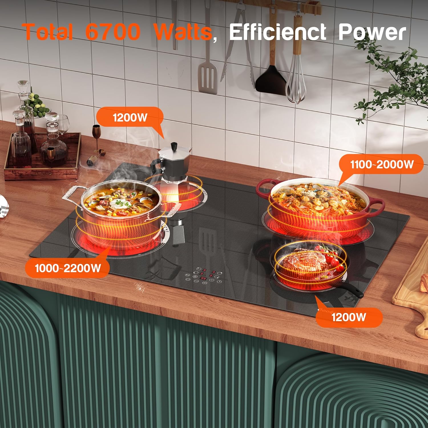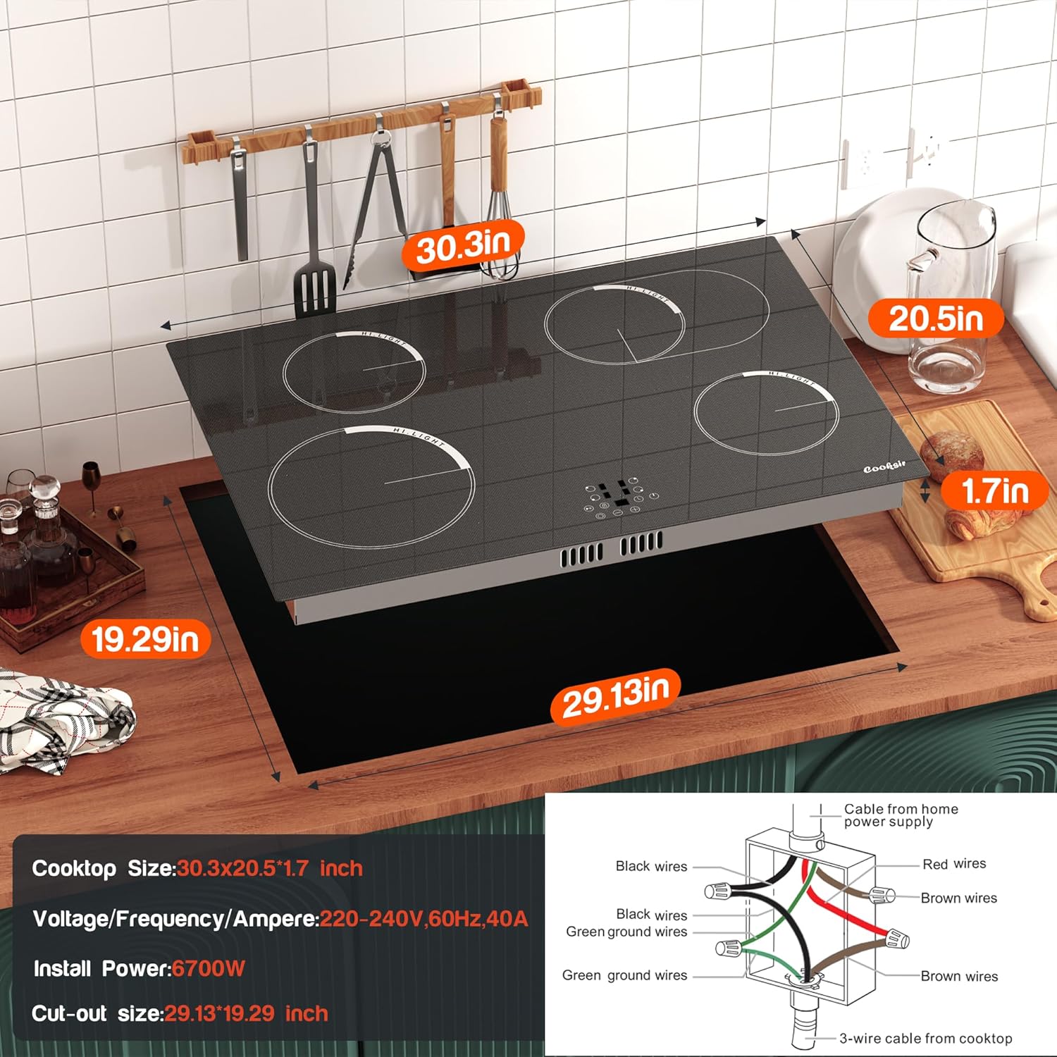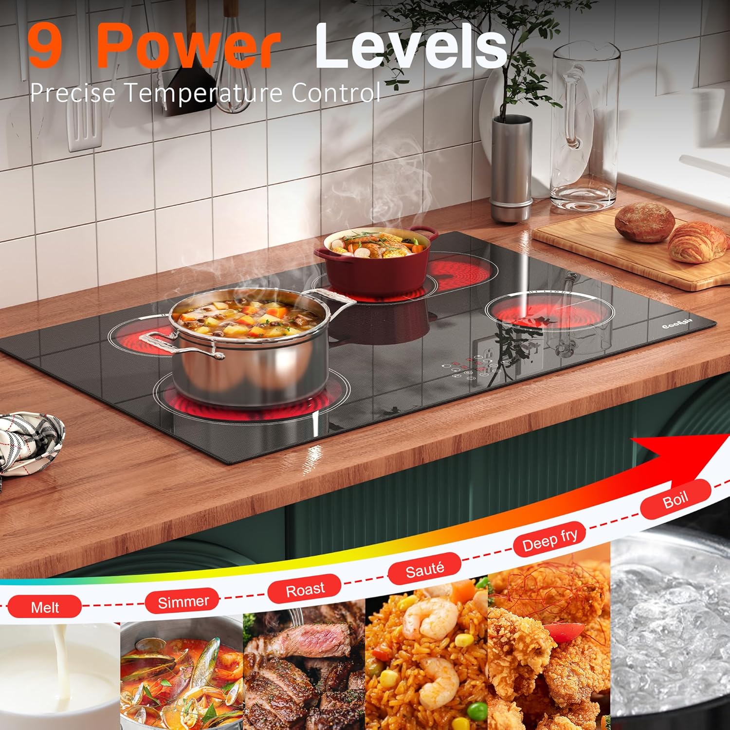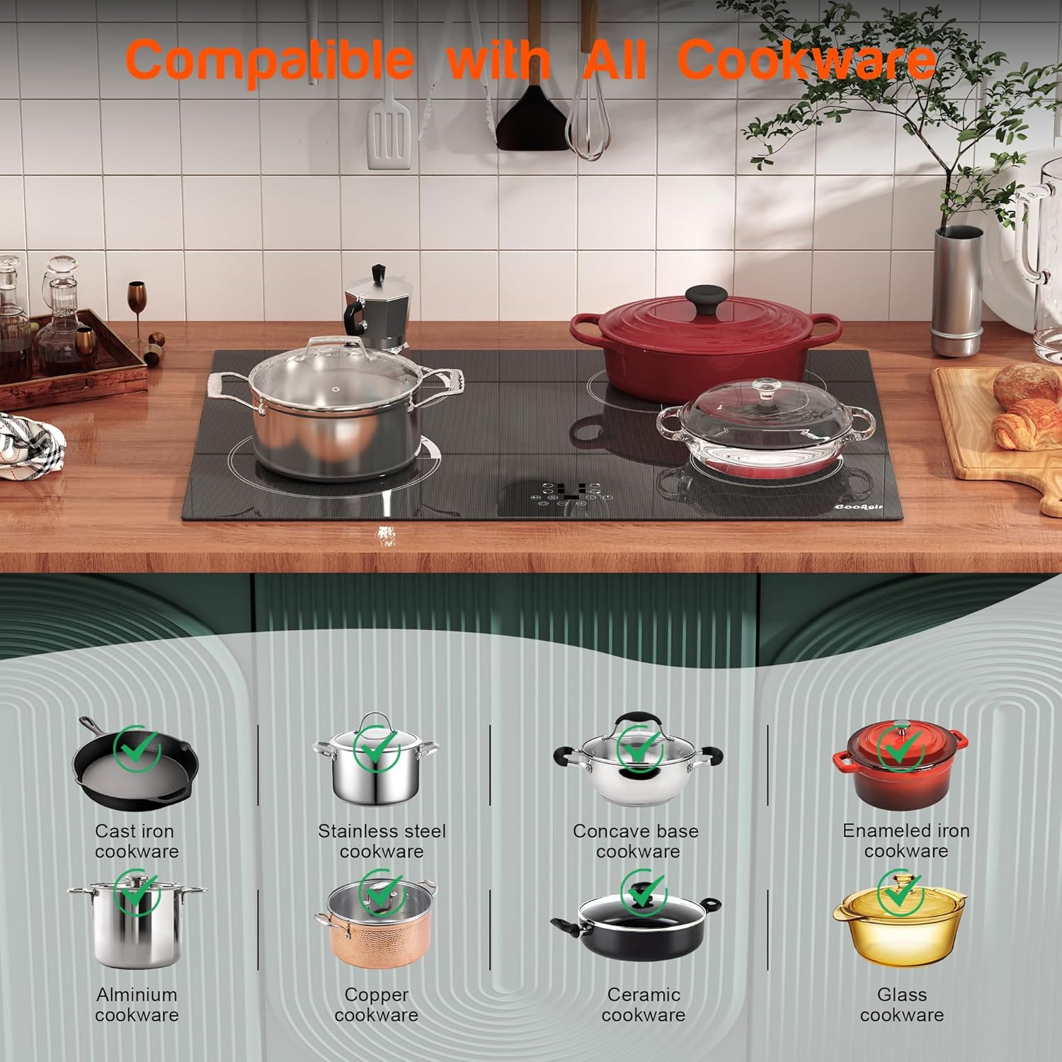 - 【Suitable for All Types of Cookers】Cooksir electric stove top can be used with any type of cookware in your home, such as aluminium pans, copper pans, cast iron frying pans and non-magnetic stainless steel pans. But please make sure that the the bottom of the cookware should be flat. Cooksir 30 in 4 burner ceramic hob can heat your dishes efficiently with minimal heat loss. Product Size: 30.3"D x 20.5"W x 1.7"H.