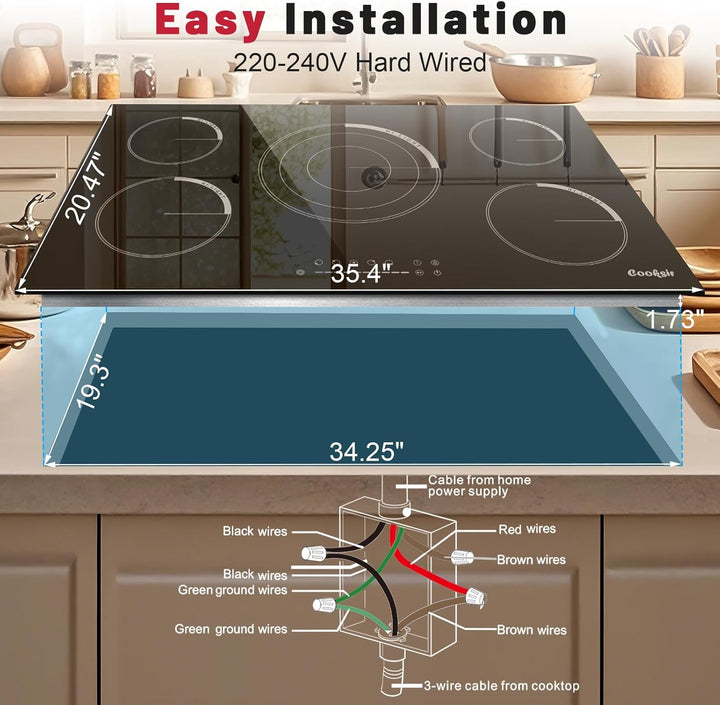 - 【Drop-in 36 Inch Ceramic Cooktop】 Cooksir 36" cooktop burner can perfectly fit into your kitchen table and save more space, needing a professional electrician for wiring. If you have suitable space for this 5 burners kitchen cooktop, you can directly install it into your kitchen counter. This 36" electric stovetop must connect with wires. Product Size (L*W*H): 35.4in(900mm)*20.5in(520mm)*1.7in(44mm) Build-in Size (L*W): 34.2in(870mm)*19.2in(490mm)