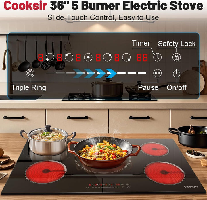Cooksir 36 Inch Electric Cooktop - Built-in 36 Inch Electrical Stove 240V, 9200W Five Burner Ceramic Cooktop, Slide-Touch Control, Timer, Safety Lock, Electric Stovetop, 220-240V Hard Wired (No Plug)