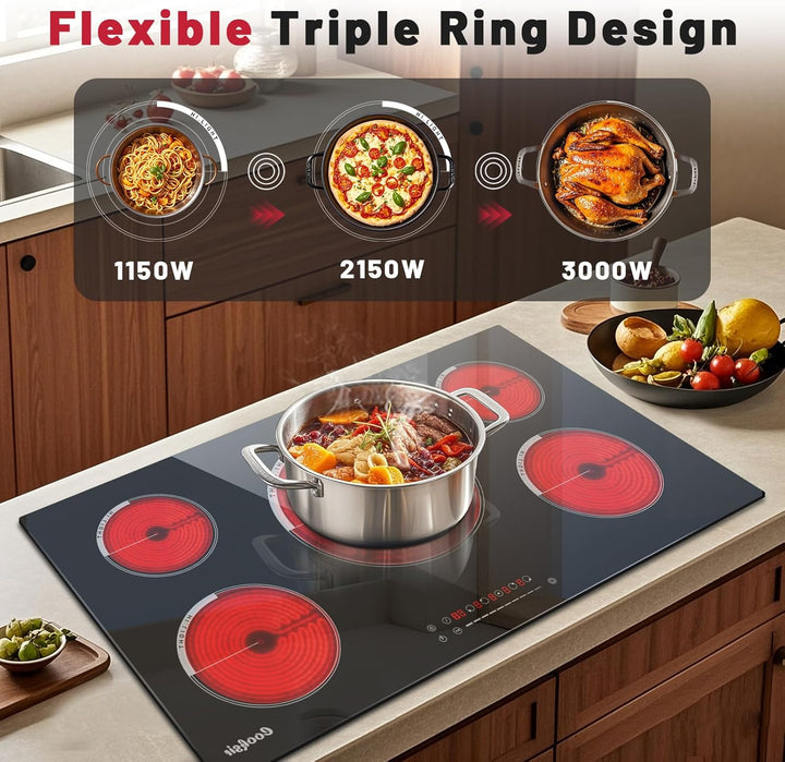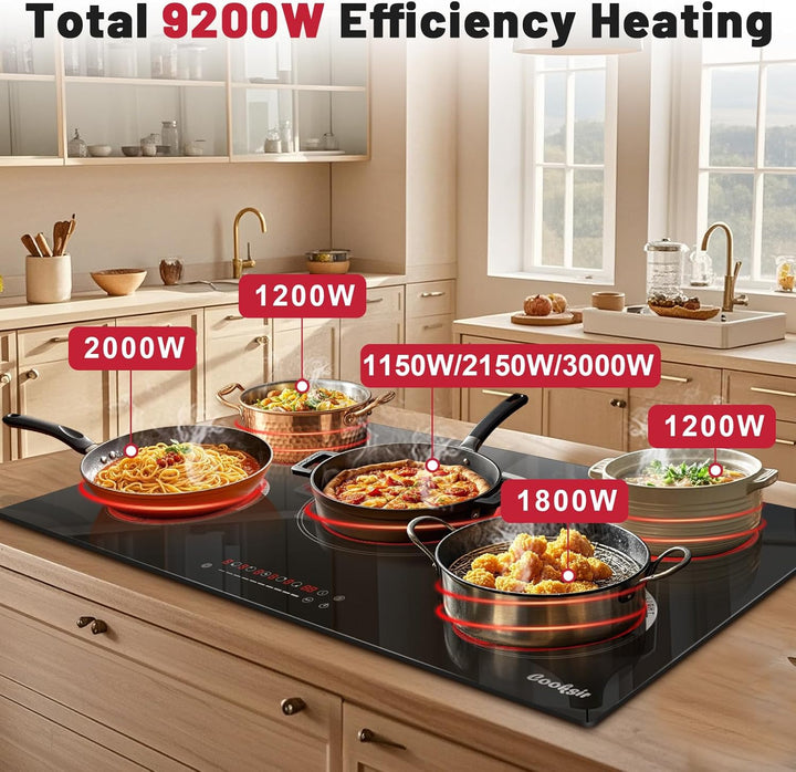 - 【9200W High Power Electric Cooktop】 Cooksir 36 inch electrical stove cooktop has 5 burners, one of which has triple heating zone. 5 burners in different size provide convenience for cookware in diversified sizes. Cooksir 30" electric stove can reach the high power levels of 9200W: 2000W+1200W+1200W+1800W+3000W so the food can be heated up quickly. 5 burners and high power levels can bring you an efficient and enjoyable cooking experience.