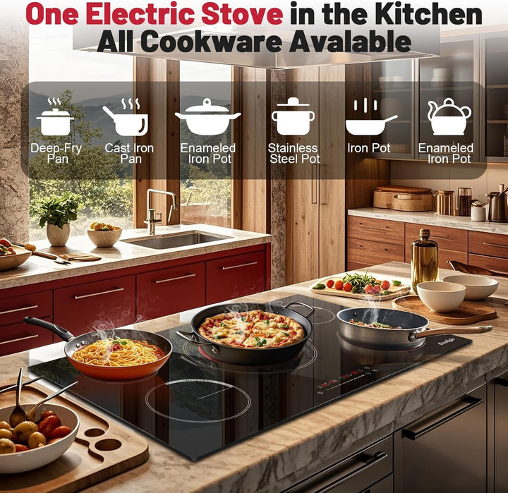 - 【Heat Warning & Compatible with All Cookware】When the temperature of cooking zone is too high, there will show "H" to warn you to keep away from it. The 36 inch electrical cooktop can be compatible with various cookware, providing you with a convenient cooking experience. All the flat cookware with different material can be heated easily. Make sure your cookware is smooth, flat and is the same size as the cooking zone.