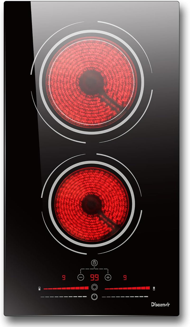 - 【3200W High Power Heating Levels】Disaenvir 12" electric stovetop has total 3200w heating power: 1200W+1000W/2000W(dual ring). Each heating zone features with 9 power levels, providing different temperature to meet the needs of different cooking styles. Perfect for braise, fry, simmer, steaming, boil, stir-frying, or roast.