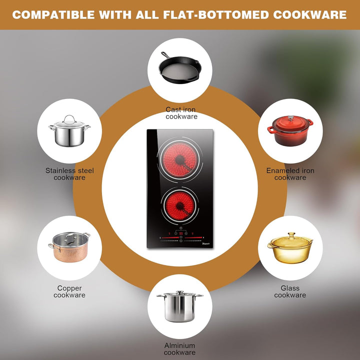 - 【Works with All Flat Cookwares】Various materials of pots and pans can be used on this 12 inch electric stove top burner such as iron, stainless steel, ceramics, glass, and other high-temperature resistant pots. But make sure that the bottom of the cookware should be flat. Moreover, the electric ceramic stove has no electromagnetic radiation and is harmless to the human body.