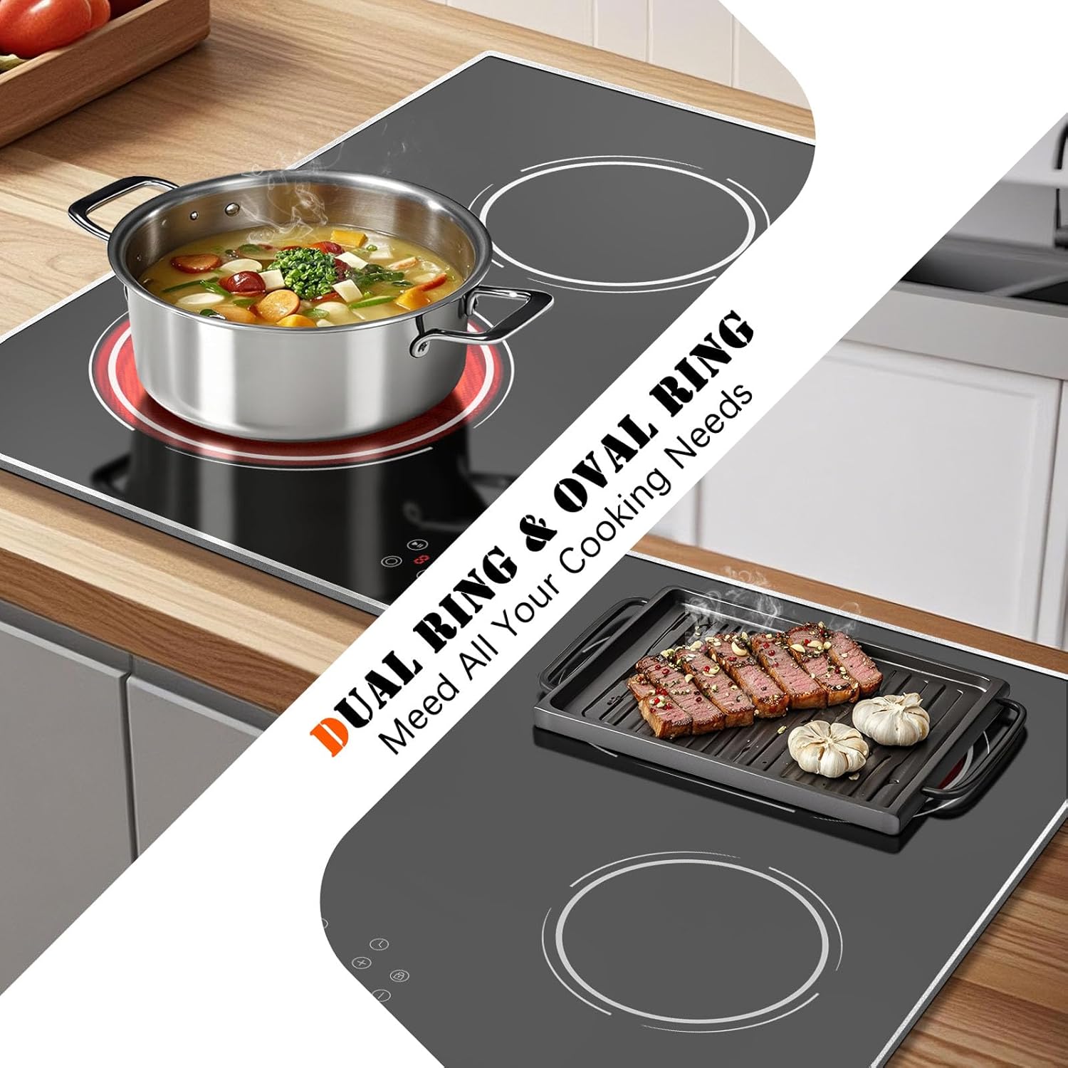 - | 220-240V Built-in Installation | Product Size: 30.3"L x 20.5"W x 2.1"H, Cut-out Size: 28.74"L x 19.3"W. This 30-inch electric cooktop is designed for built-in installation, providing a sleek and integrated look in your kitchen. It features a 220-240 volt hard wire connection so you'd better hire an tecnician to do the wiring. This hard-wired setup not only ensures a reliable and stable power supply but also enhances the safety and efficiency of your cooking area.