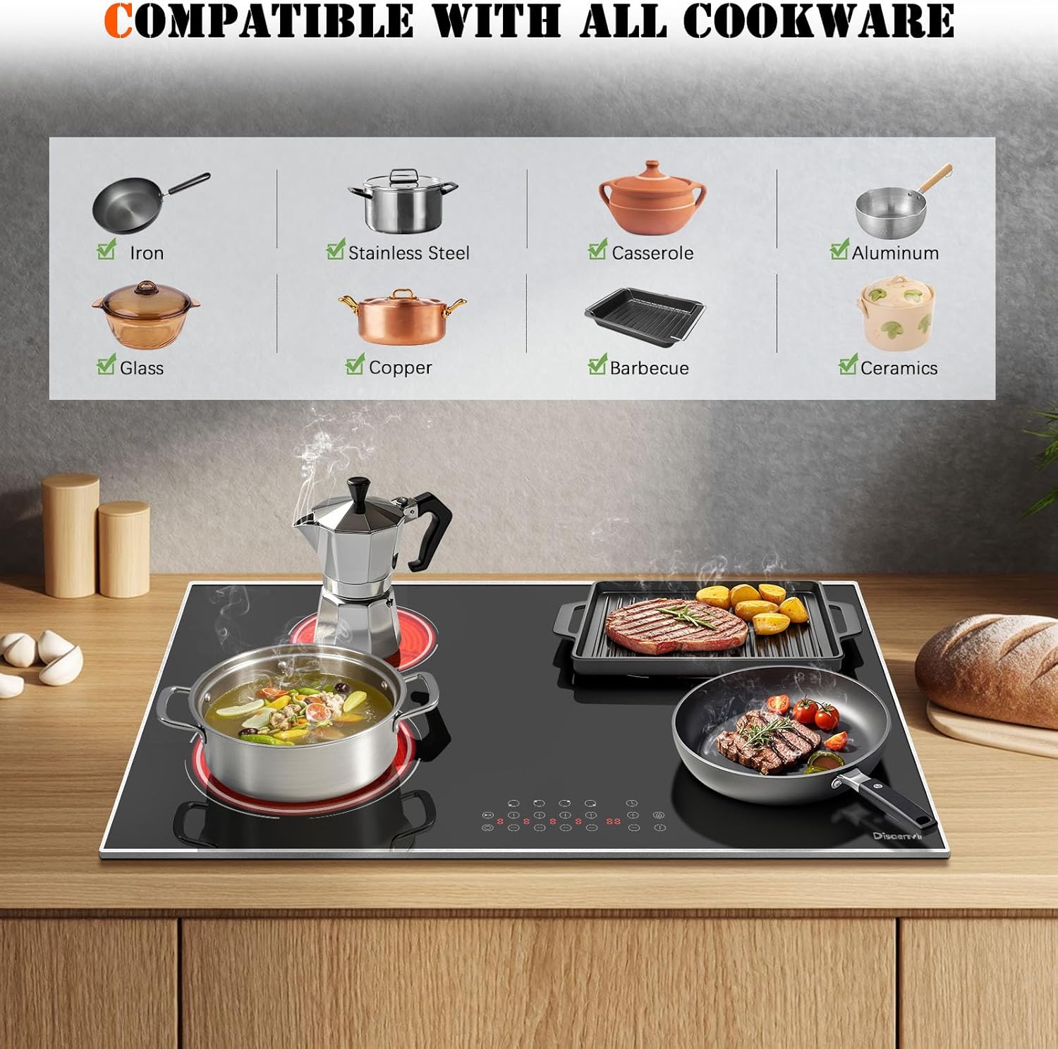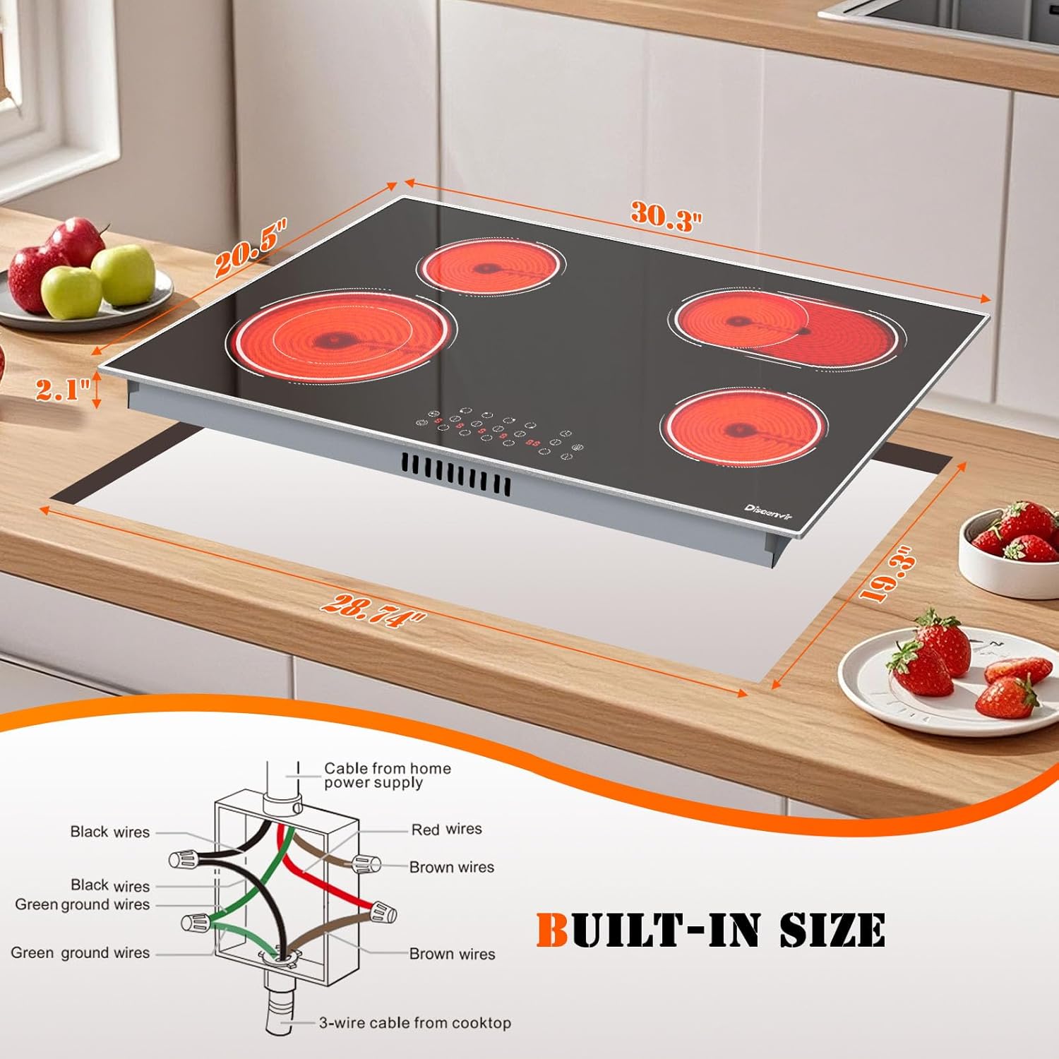 Disaenvir Electric Cooktop 30 Inch - 4 Burner Powerful Glass Electric Stove Top 6600W, 30 Inches Built-in Ceramic Stove with Dual & Expanded Ring, Timer, Safety Lock, 220V - 240V Hard Wire(No Plug)