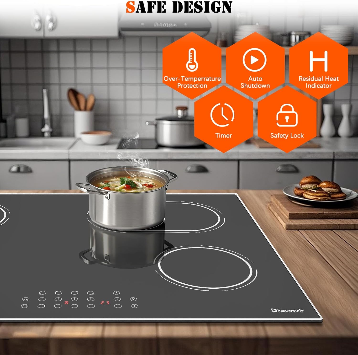 - | Advanced Safety and Convenience | Disaenvir 4 burner electric cook top is equipped with many functions. The timmer function allows you to set cooking durations ranging from 1 to 99 minutes for each burner. The safety lock is designed to prevent unauthorized access or accidental activation of the cooktop, providing extra protection for kids and pets. Additionally, the residual heat indicator is a thoughtful safety feature that alerts you when the cooktop surface is still hot after cooking, preventing accidental burns and injuries.