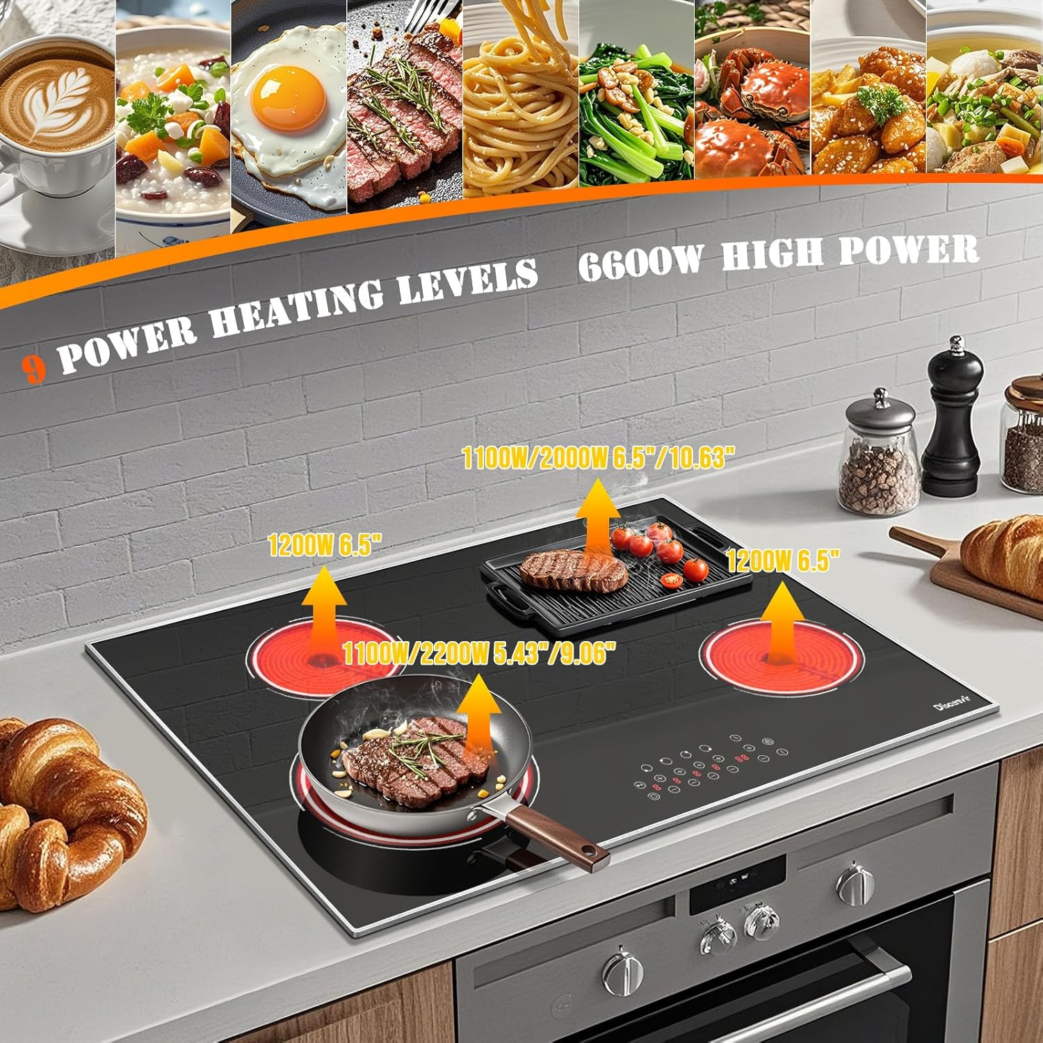 - | Powerful 6700W Heating Power | Disaenvir 30 inch electric cooktop boasts a 4-burner layout with a total power output of 6600 watts(1200W+1200W+2000W+2200W), ensuring efficient and effective cooking. The independent fourth burners provide a choice between 1200 watts and 2200 watts, making it ideal for rapid boiling or gentle melting. This range allows for precise temperature control and caters to various culinary techniques.