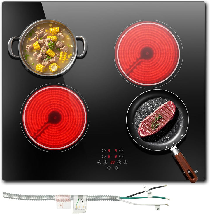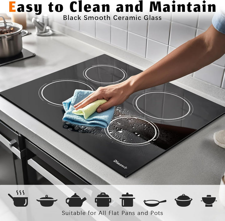 Disaenvir 24 Inch Electric Cooktop - 4 Burner Glass Electric Stove Top 6000W, 24 Inches Built-in Ceramic Stovetop with Timer, Safety Lock, Pause, Touch Control, 220V - 240V Hard Wire(No Plug)
