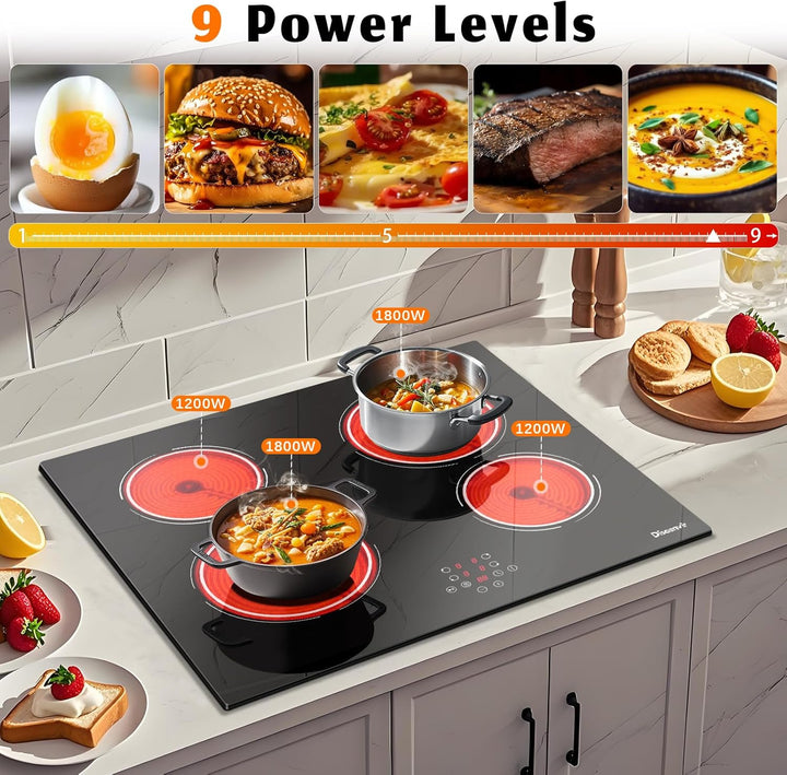 - 【6000W Powerful Heating Zones】Disaenvir 24" 4 burner electric cooktop delivers an impressive 6000 watts(1800w+1800w+1200w+1200) of powerful heating power, strategically allocated across four independent heating zones. This high-power design ensures that each burner can handle a variety of cooking tasks with ease, from gentle simmering to high-heat frying.