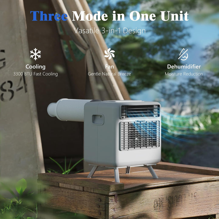 - | 3300 BTU Fast and Powerful Cooling | With a 3300 BTU capacity, this air conditioner quickly lowers temperatures, providing instant relief from heat. Its high BTU rating ensures effective cooling in any outdoor setting, making it ideal for summer adventures.