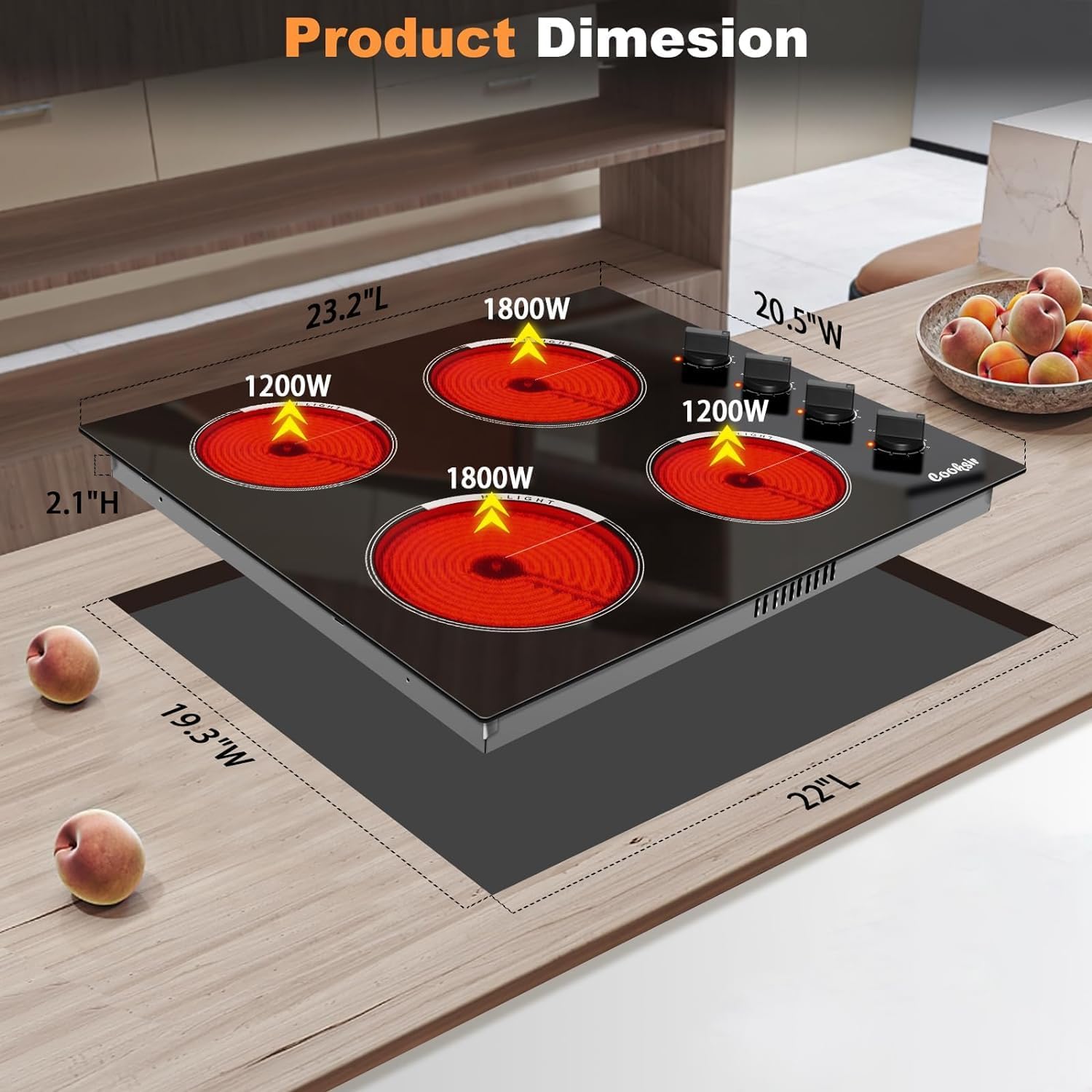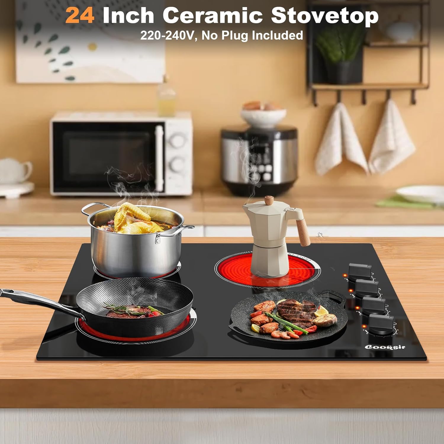 Cooksir Electric Cooktop 24 Inch - 4 Burner Built-in Electric Stove Top 6000W, Radiant Electrical Stovetop with 9 Heating Level, Knob Control, Auto Shut Off Protection, 220-240V Hard Wired (No Plug)