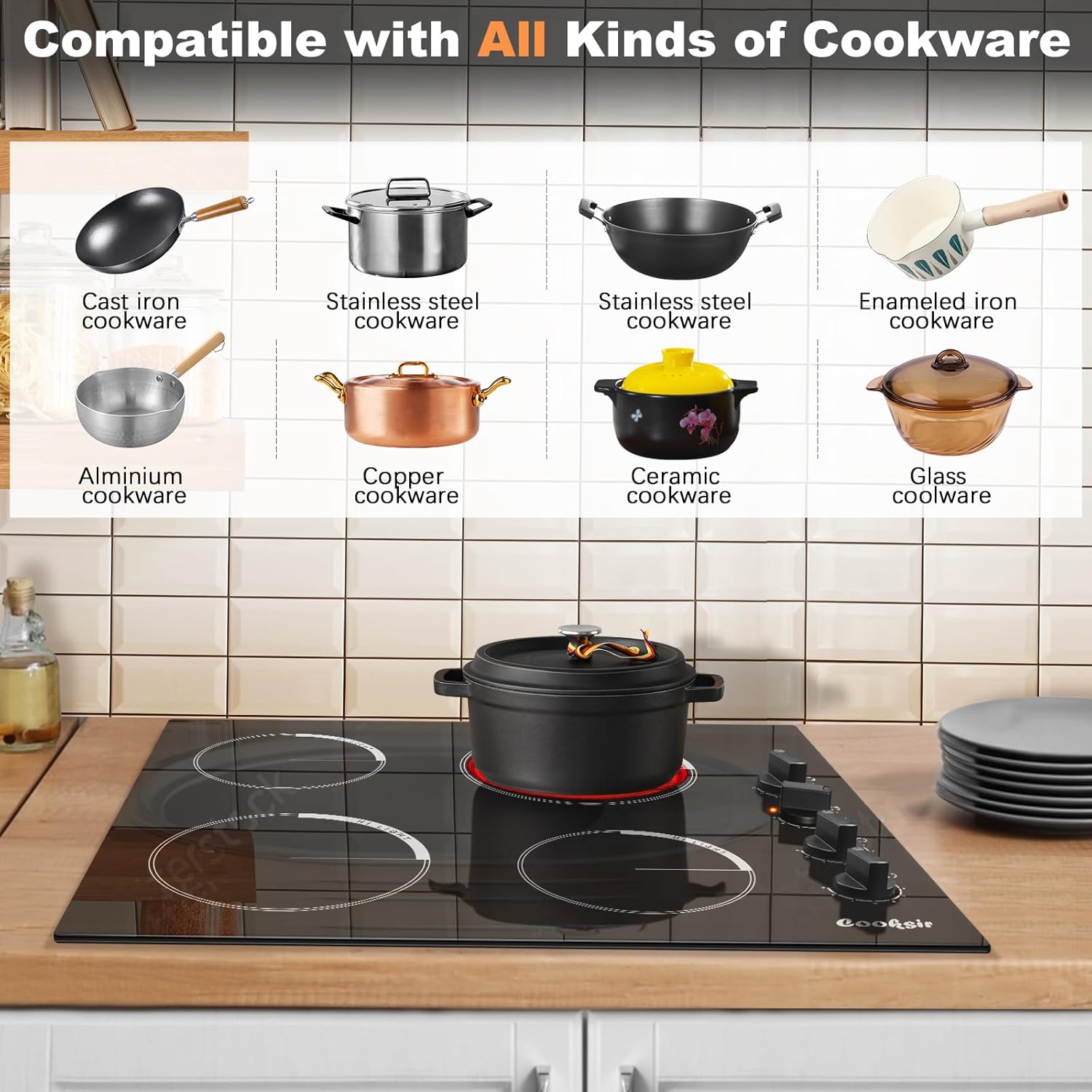 - 【Suitable for All Types of Cookers】Cooksir electric stove top can be used with any type of cookware in your home, such as aluminium pans, copper pans, cast iron frying pans and non-magnetic stainless steel pans. 4 burner ceramic hob can heats cookware efficiently with minimal heat loss. Simply wipe with a clean cloth when cool.