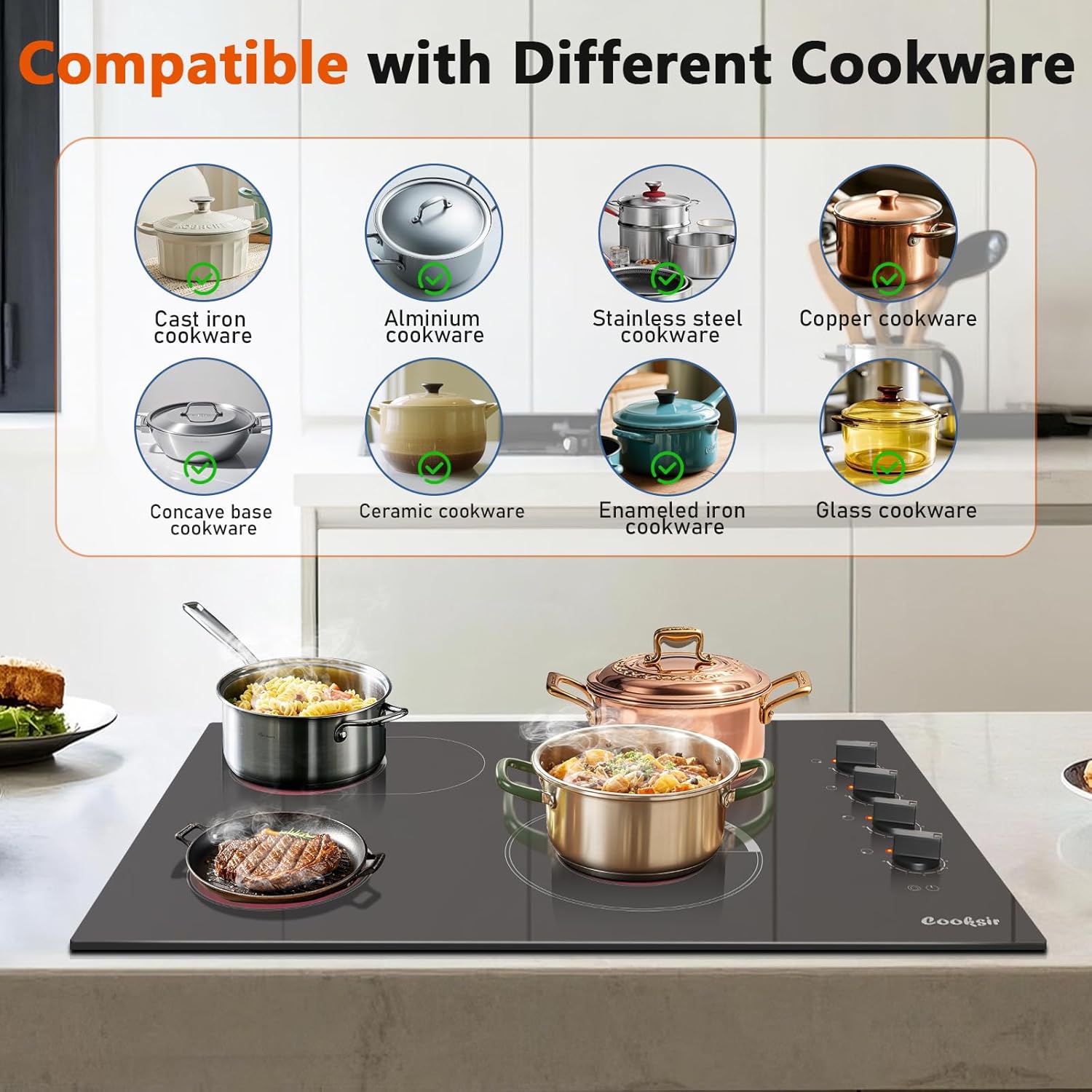 - 【Suitable for All Types of Cookers】Cooksir electric stove top can be used with any type of cookware in your home, such as aluminium pans, copper pans, cast iron frying pans and non-magnetic stainless steel pans. 4 burner ceramic hob can heats cookware efficiently with minimal heat loss. Simply wipe with a clean cloth when cool. Product Size: 30.3"L x 20.5"W x 2.1"H, Cut-out Size: 29"L x 19.3"W.