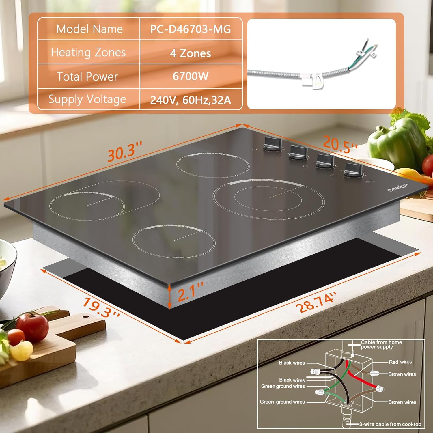 - 【220-240v 6700W High Power】In general, low-power electric ceramic stoves heat more slowly. To solve this problem, Cooksir 4 burner electric ceramic hob will provide a high power combined up to 6700W. To achieve such high power, this 30 inch electric cooktop needs to be connected to 220-240v. It doesn't have a plug, and if you don't know how to install it, you'll need to call an electrician for help. High power burner, heating faster.