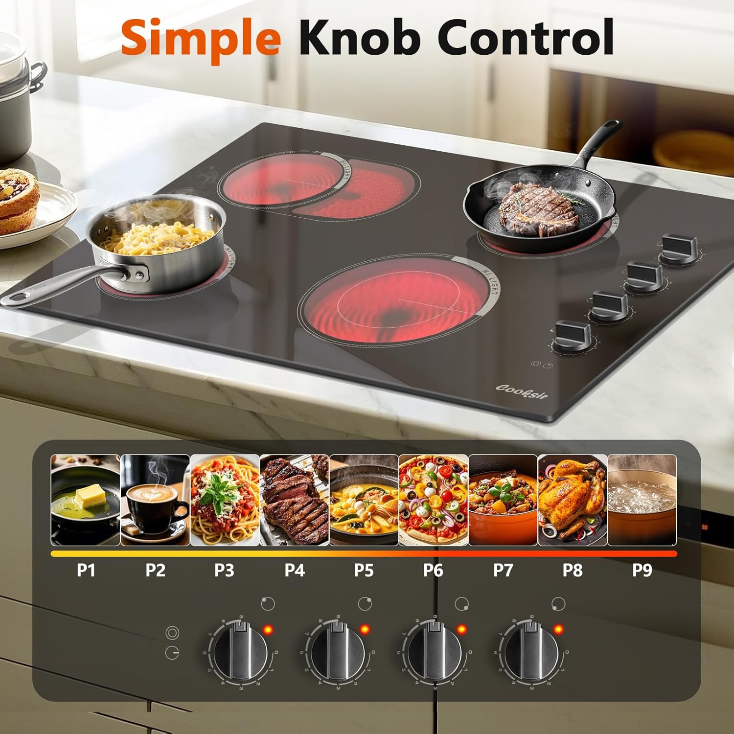 Cooksir Electric Cooktop 30 Inch - 4 Burner Built-in Glass Ceramic Stovetop 6700W, 30 Inches Electric Cooktop with Oval & Expanded Ring, Knob Control, Overheat Protection, 220V-240V Hard Wire(No Plug)