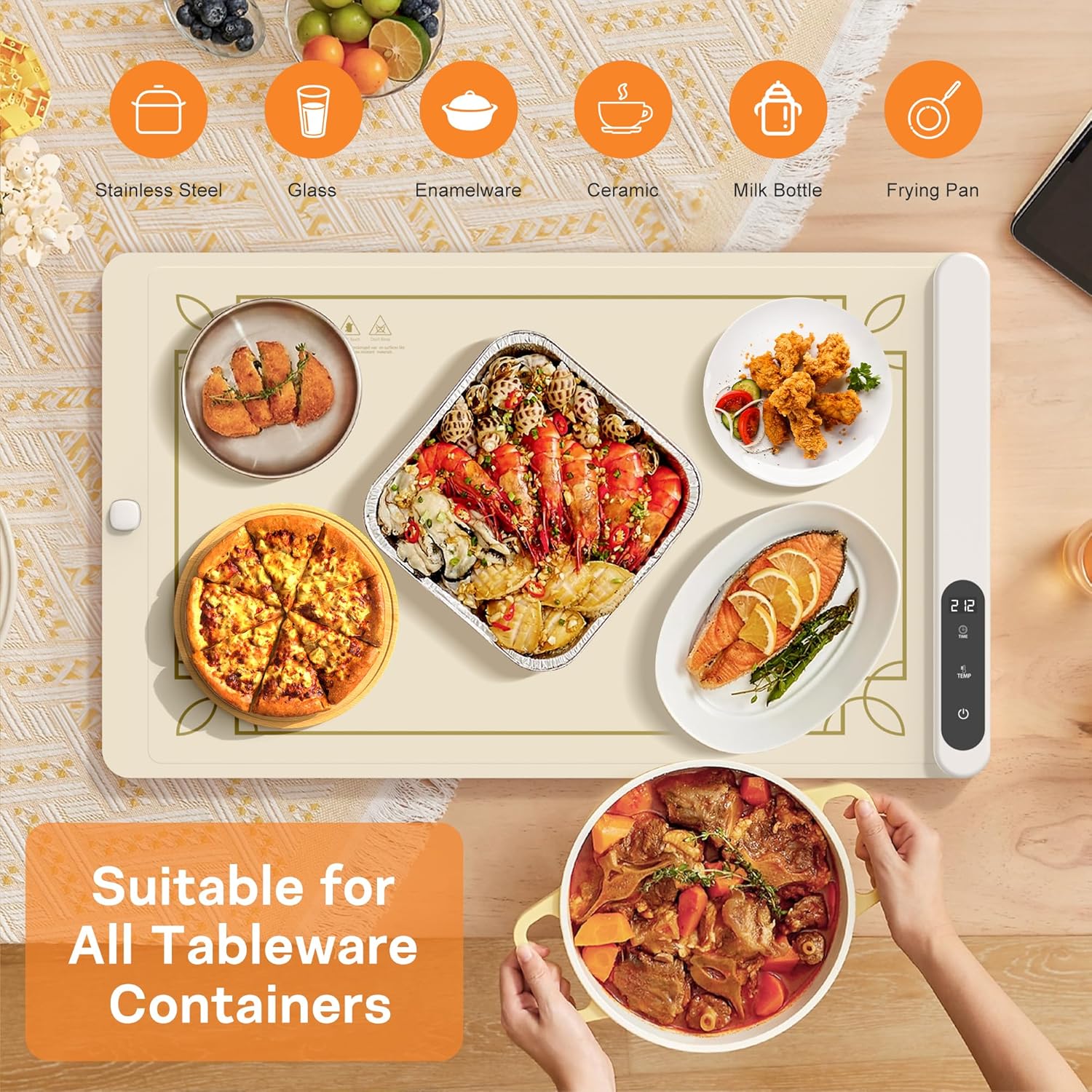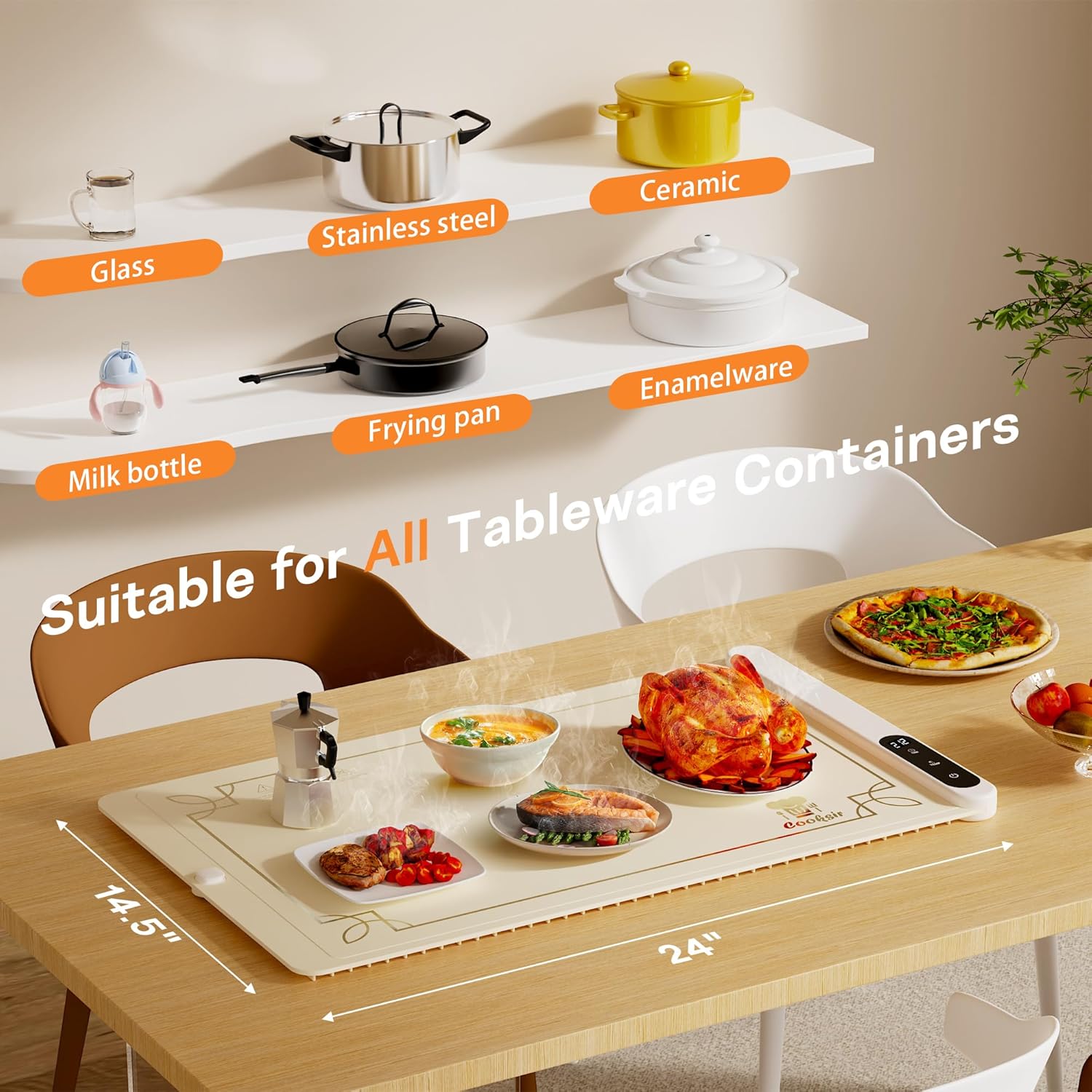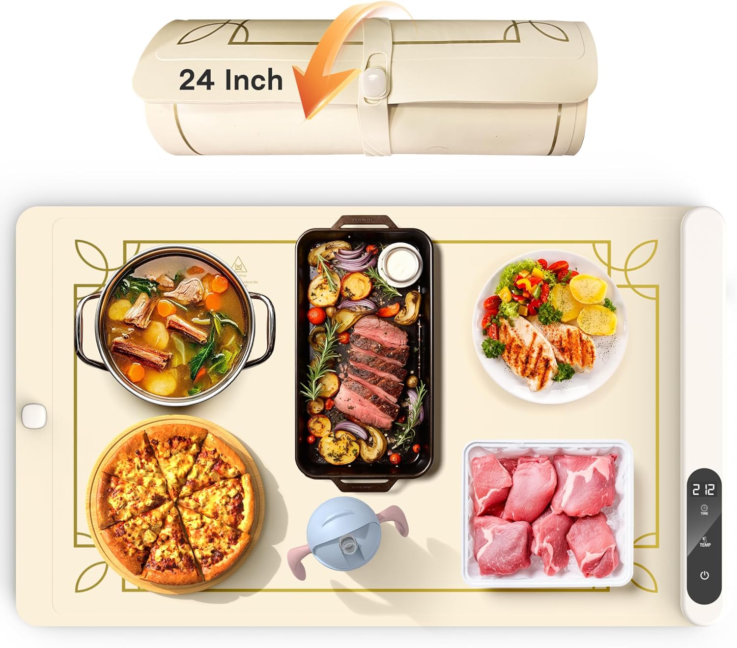 Cooksir Electric Food Warming Mat - Foldable Warming Tray for Food, Graphene Full Surface Silicone Warmer for Buffets, Parties, Gatherings, Holidays, 6 Level Temperature, Timer, 24 Inch (Cream White)