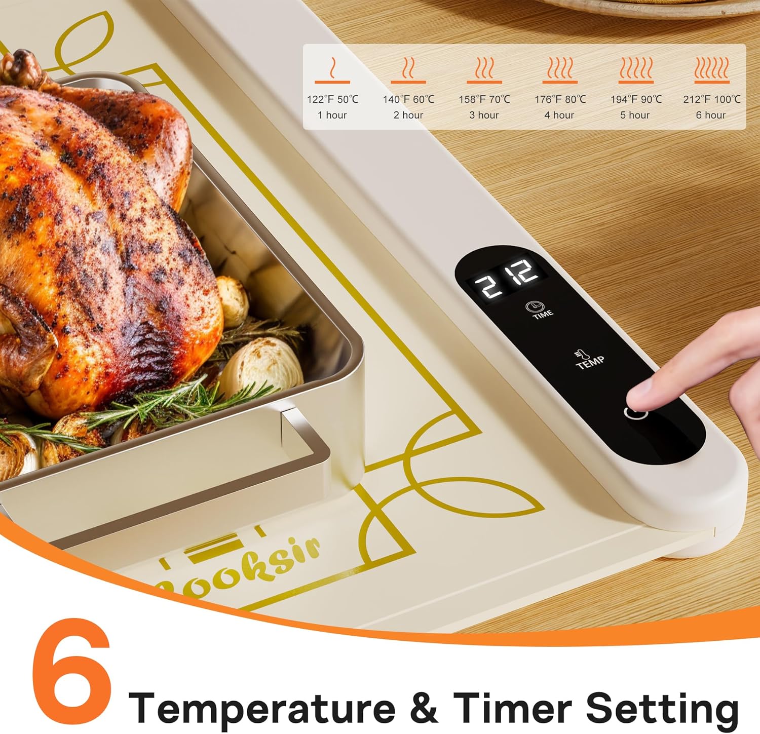 - 【6 Level Temperature Control】This white electric warming tray features an advanced 6-level temperature control system (122℉,140℉, 158℉, 176℉, 194℉, 212℉), covering low to high temperatures, allowing you to customize the heat to suit a variety of dishes. Whether you're warming up delicate desserts or hearty casseroles, the adjustable settings ensure that each dish is warmed to perfection.