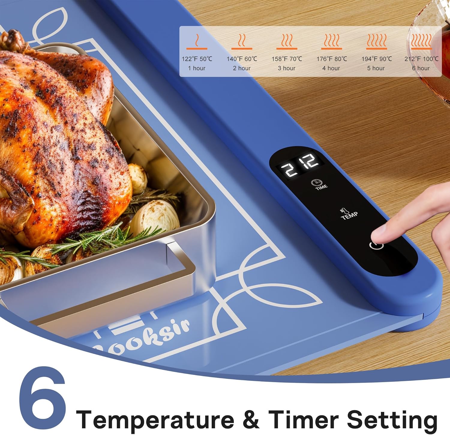 - 【6 Level Temperature Control】This blue electric warming tray features an advanced 6-level temperature control system (122℉,140℉, 158℉, 176℉, 194℉, 212℉), covering low to high temperatures, allowing you to customize the heat to suit a variety of dishes. Whether you're warming up delicate desserts or hearty casseroles, the adjustable settings ensure that each dish is warmed to perfection.