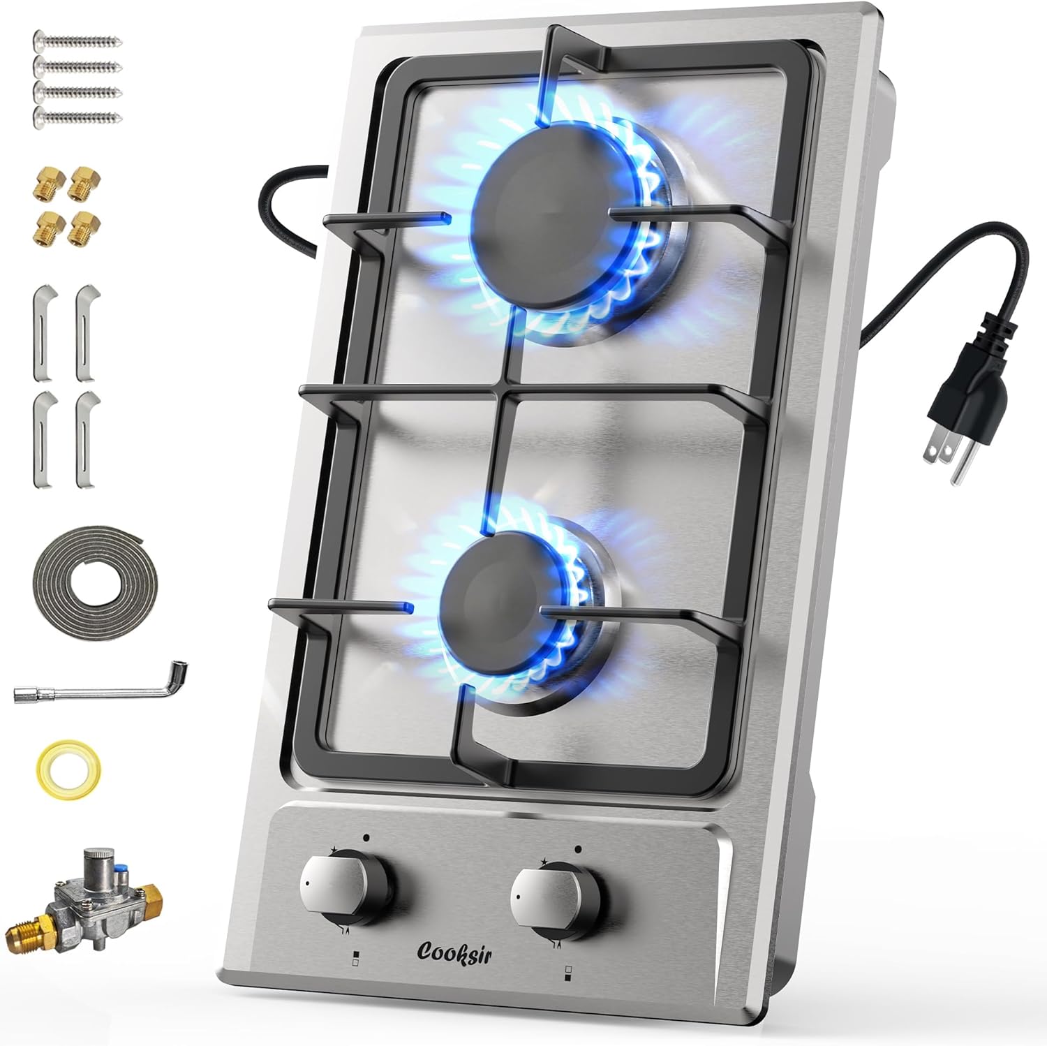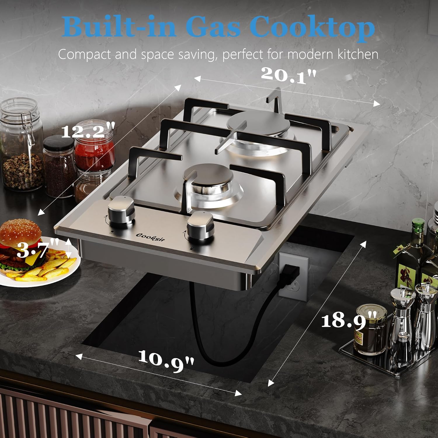 Cooksir Gas Cooktop 2 Burner - 12 Inch Built-in 2 Burner Propane Stove, NG/LPG Convertible Stainless Steel Gas Stovetop with Flame Out Protection for Apartment, Kitchen, RV, Dorms, 110V Plug in