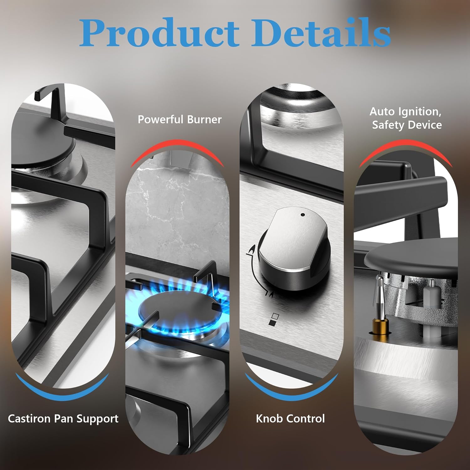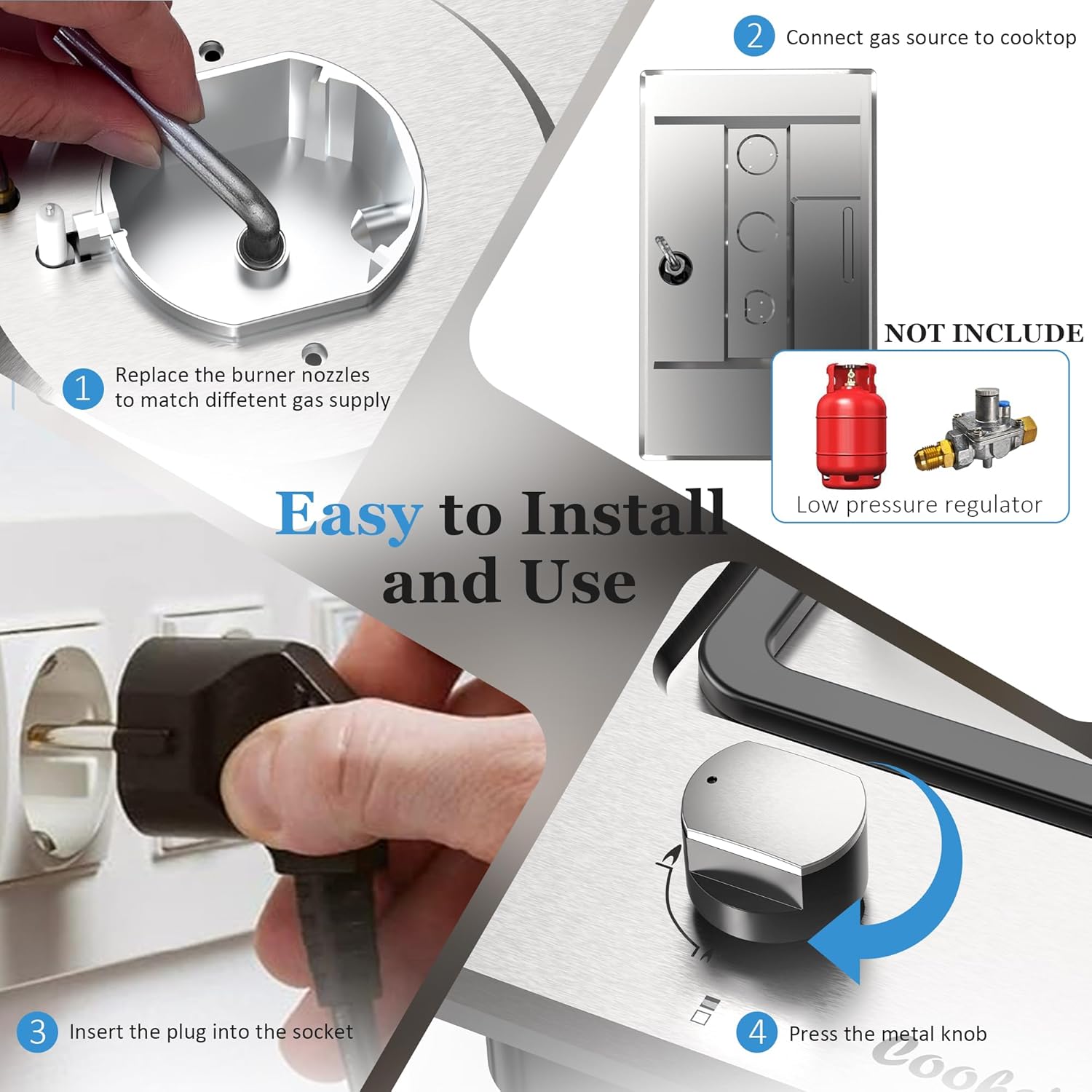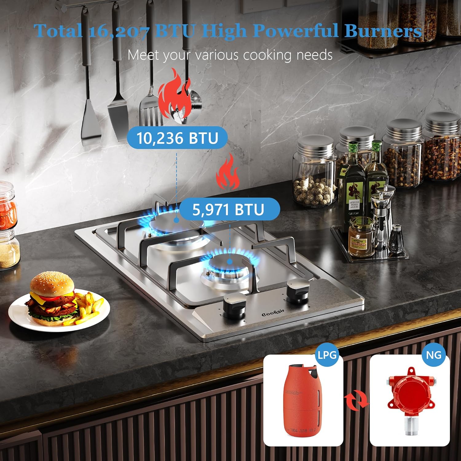 - 【2 Powerful Burners, Rapid Heating】The 12 inch gas cooktop has 2 high efficiency sealed burners, a 5971-BTU semi-rapid burner and a 10236-BTU super rapid burner. With the 10236-BTU rapid burner, you can cook food in a shorter time, greatly reducing the cooking time. Our 12" gas cooktop is equipped with Bakelite + stainless steel mixed material knob, which is durable, insulated, not afraid of hot hands.