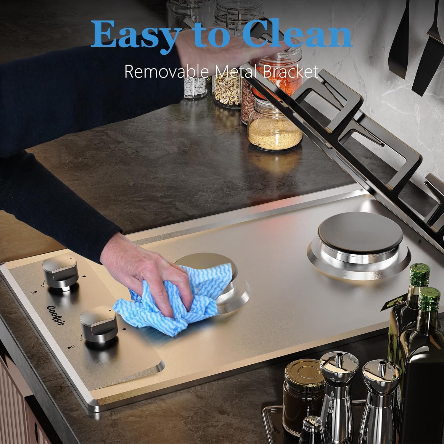 - 【Removable Cast-iron Grates for Easy Cleaning】The 2 burner propane stove is made of 304 stainless steel equiped with a heavy duty cast iron grates which can provides a more stable support that can hold heavy cookware. It is worth mentioning that the iron frame of the gas hob can be moved when cleaning the gas stove 2 burner. It's more convenient for cleaning. Gas cooktop with smooth stainless steel surface, you just need to wipe it with a damp towel.