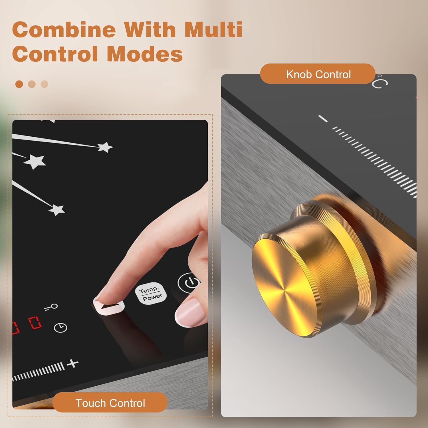 - | Intuitive Control Interface | Our 2 burners electric stove 24" is fitted with an LCD touchscreen and knob control, offering a seamless blend of modern technology and traditional ease of use. This dual control system allows for quick temperature adjustments and precise setting of cooking times, enhancing the overall cooking experience.