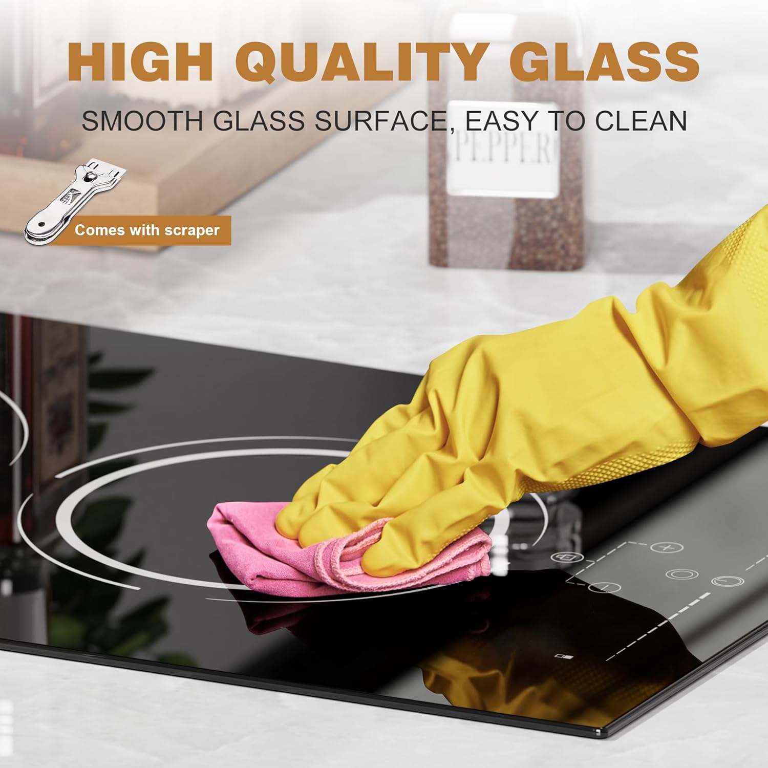 - 【Smooth Glass Cooktop for Easy Cleaning】The black smooth glass on the surface of this 2 burner electric cooktop is made of high-quality materials, which is sturdy, durable, scratch resistant, high-temperature resistant, and easy to clean. Just need to be lightly wiped with a damp cloth. By the way, this glass stove's package comes with a cleaning scraper tool.