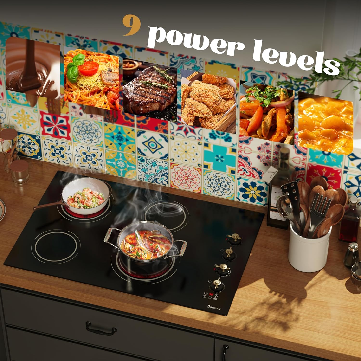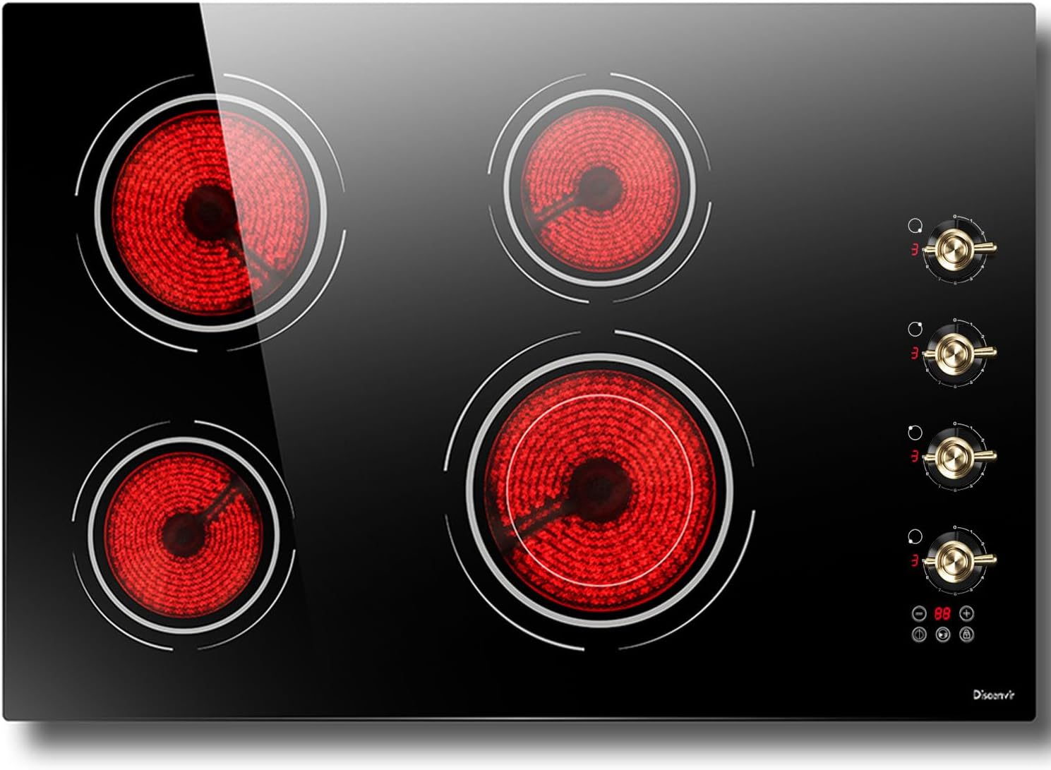 - 【Safety Features for Peace of Mind】This 4 burner electric cooktop 30 in is equipped with various safety features to ensure a secure cooking experience. The sensor touch controls offer a safety lock function, preventing accidental activation and keeping your children safe in the kitchen. Disaenvir cooktop also features residual heat indicators that alert you when the surface is still hot, reducing the risk of burns or accidents. Besides, automatic shut-off function is included in case you forget to turn off the electric stovetop.