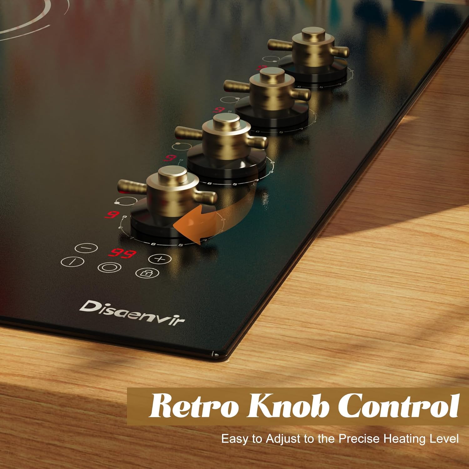 - 【Touch & Retro Knob Control】Disaenvir 30 inch electric cooktop with 4 burners is designed with sensor touch and knob control, which is a unique and novel style in the market. With the combination of sensor touch and knob control, you have precise control over the heat levels and can easily adjust them according to your recipes. The sensor touch controls provide a modern and sleek interface, while the knob control offers a tactile and traditional way of adjusting the burners.