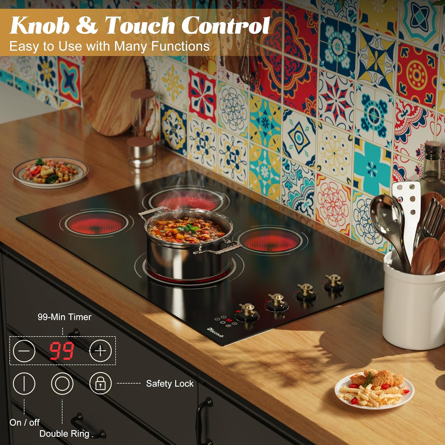 Disaenvir 30 Inch Electric Cooktop - 4 Burner Electric Stove 6700W Built-in, 30" Radiant Ceramic Cook Top Konb & Touch Control, 99-Min Timer, Safety Lock, 220V - 240V Hard Wired, No Plug (Retro Knob)
