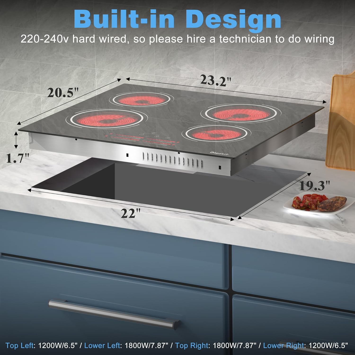 - 【Built-in Electric Cooktop 220v-240v】Note: this 6000w electric stove is a high power appliance, which is suitable for 220-240v, there is no plug, you need to find a qualified person wiring. The glass electric cooktop is built-in design install, please approve the cut-out size is suitable before purchase: Stove top Size: 23.2 in(590mm) x 20.5 in(520mm) x 1.7 in(44mm), Cut-out Size: 22 in(560mm) x 19.3 in(490mm).