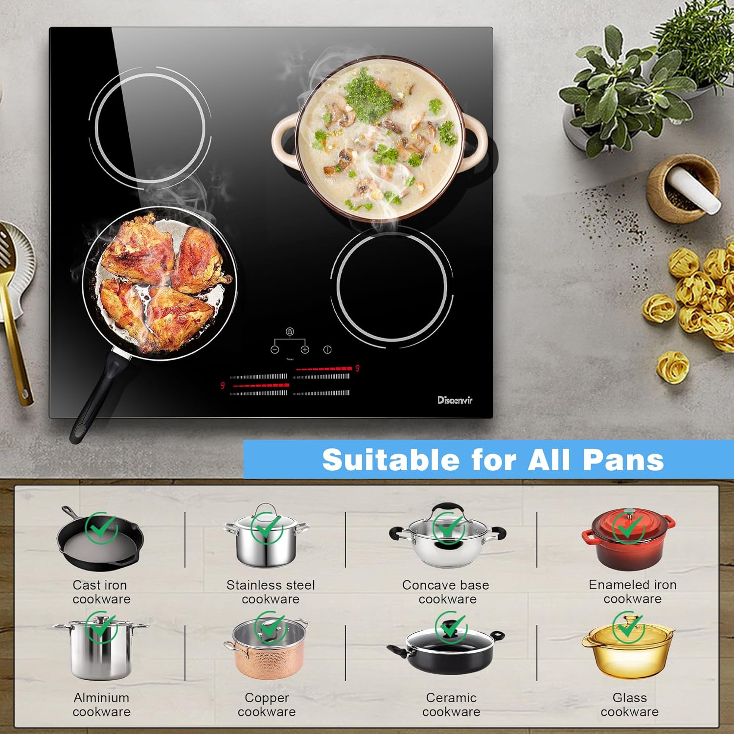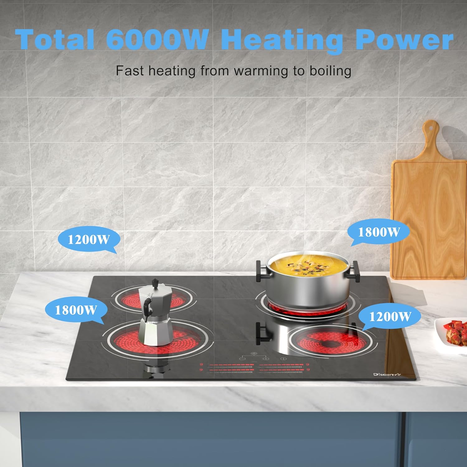 - 【6000W High Power Heating Levels】Disaenvir 24" electric stovetop has total 6000w heating power: 1800W+1200W+1800W+1200W. Each heating zone features with 9 power levels, providing different temperature to meet the needs of different cooking styles. Perfect forbraise, fry, simmer, steaming, boil, stir-frying, or roast.
