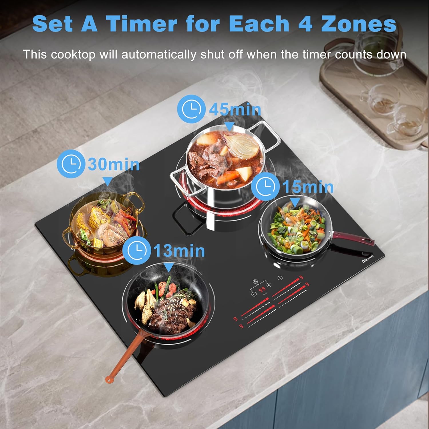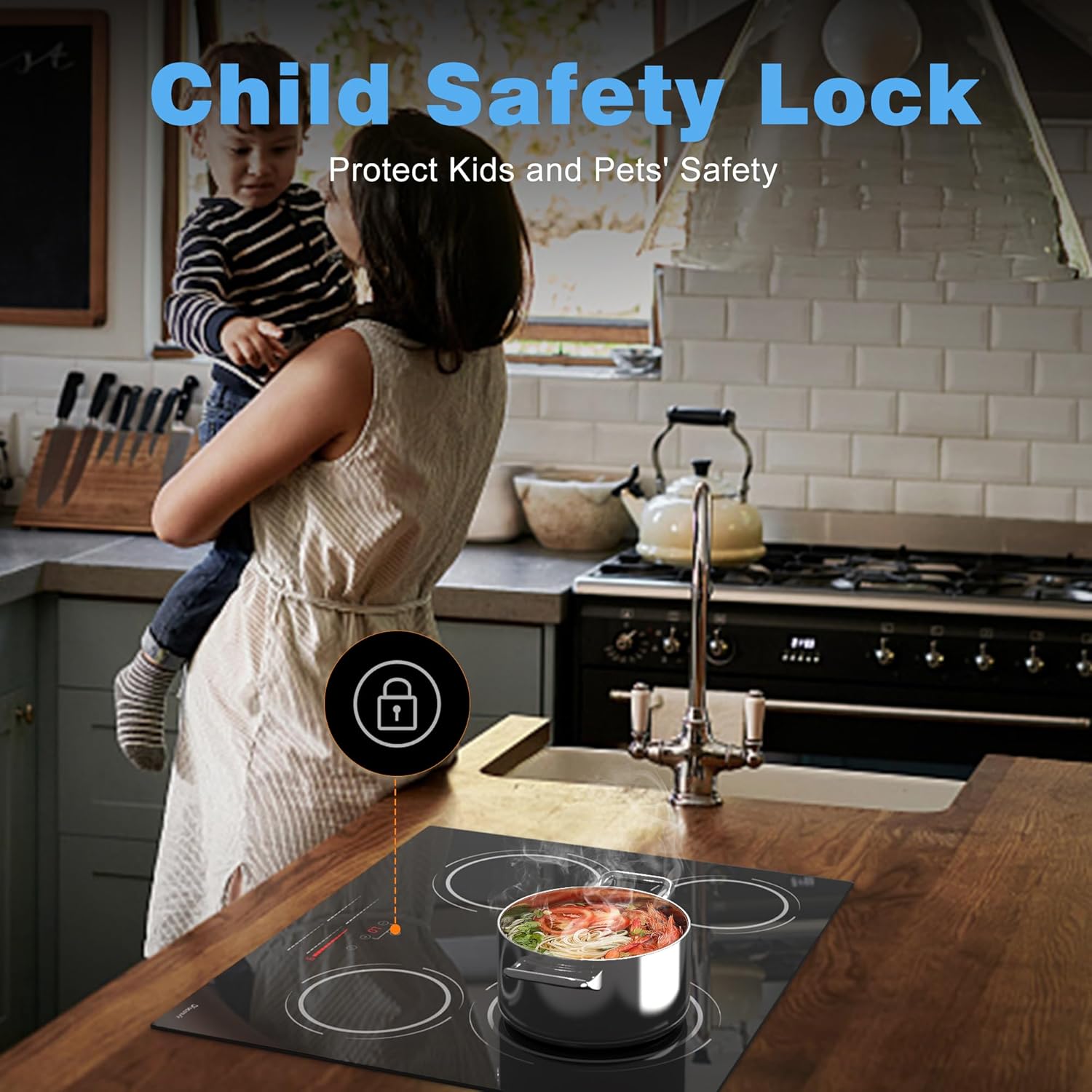 - 【Safe Cooktop for a Whole Family Use】This 4 burner electric cooktop 24 in is equipped with various safety features to ensure a secure cooking experience, such as safety lock, 0-99 min timer setting, over heat protection, residual heat indicator, pause function and automatic shut-off. Suitable for a whole family use.