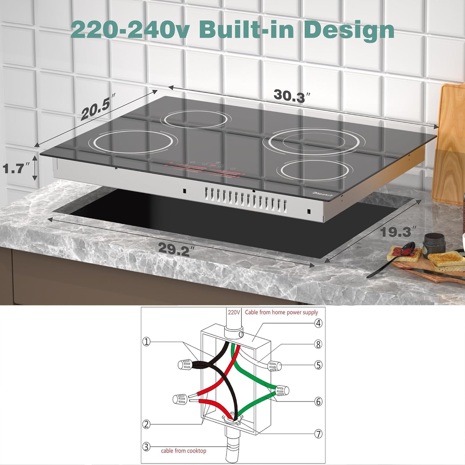 - 【Built-in Electric Cooktop 220v-240v】Note: this 6500W electric stove is a high power appliance, which is suitable for 220-240v, there is no plug, you need to find a qualified person wiring. The glass electric cooktop is built-in design install, please approve the cut-out size is suitable before purchase: Stove top Size: 30.3 in(770mm) x 20.5 in(520mm) x 1.7 in(44mm), Cut-out Size: 29.2 in(740mm) x 19.3 in(490mm).