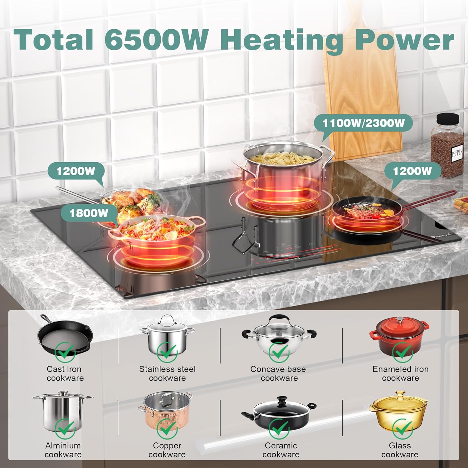 - 【6500W High Power Heating Levels】Disaenvir 30" electric stovetop has total 6500w heating power: 1800W+1200W+1100W/2300W(dual)+1200W. Each heating zone features with 9 power levels, providing different temperature to meet the needs of different cooking styles. Perfect forbraise, fry, simmer, steaming, boil, stir-frying, or roast.