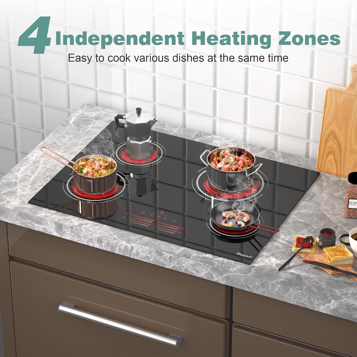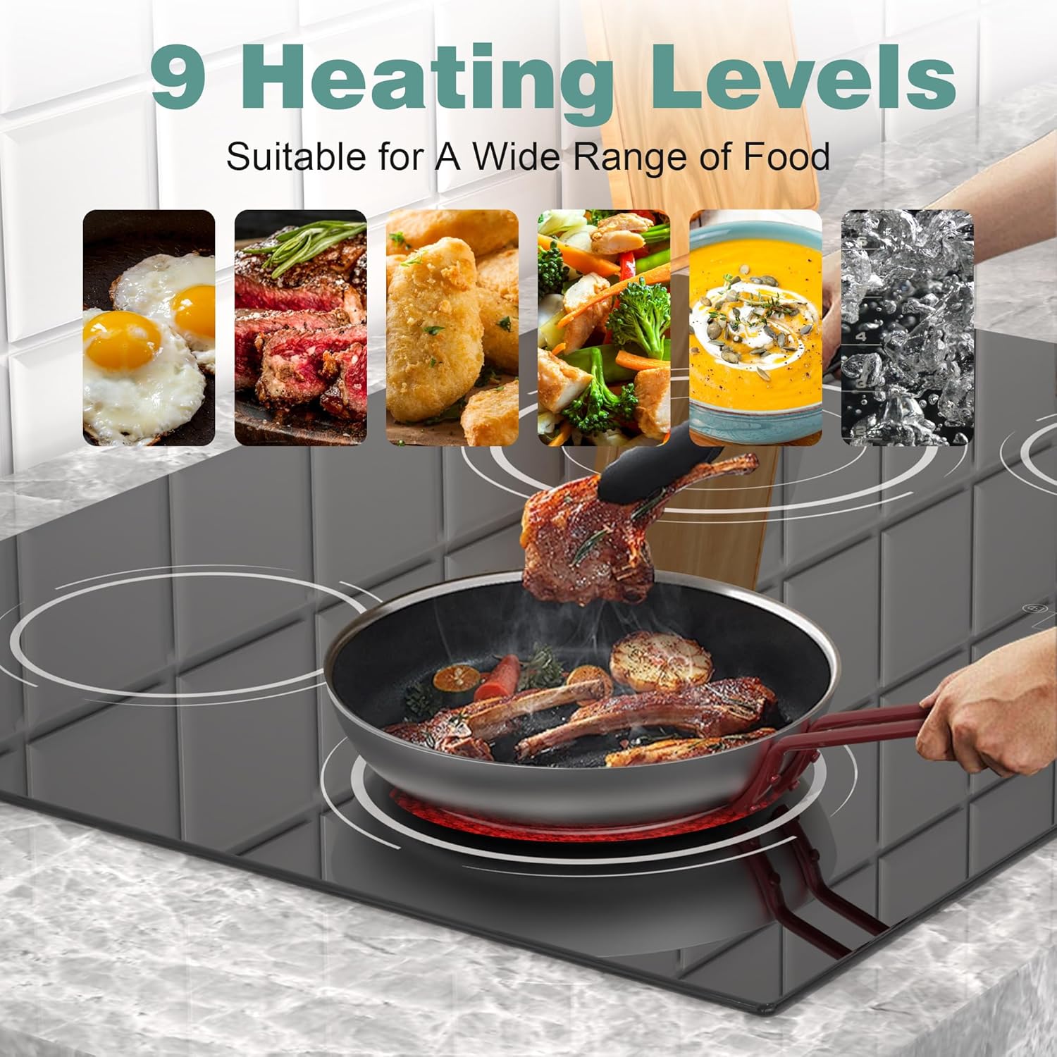 - 【Safe Cooktop for a Whole Family Use】This 4 burner electric cooktop 30 in is equipped with various safety features to ensure a secure cooking experience, such as safety lock, 0-99 min timer setting, over heat protection, residual heat indicator, pause function and automatic shut-off. Suitable for a whole family use.