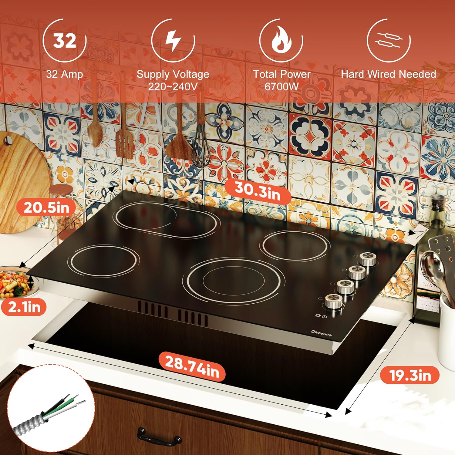 Disaenvir Electric Cooktop 30 Inch - 4 Burner Powerful Glass Electric Stove Top 6700W, 30 Inches Built-in Ceramic Stovetop with Dual & Expanded Ring, Knob Control, 220V - 240V Hard Wire(No Plug)