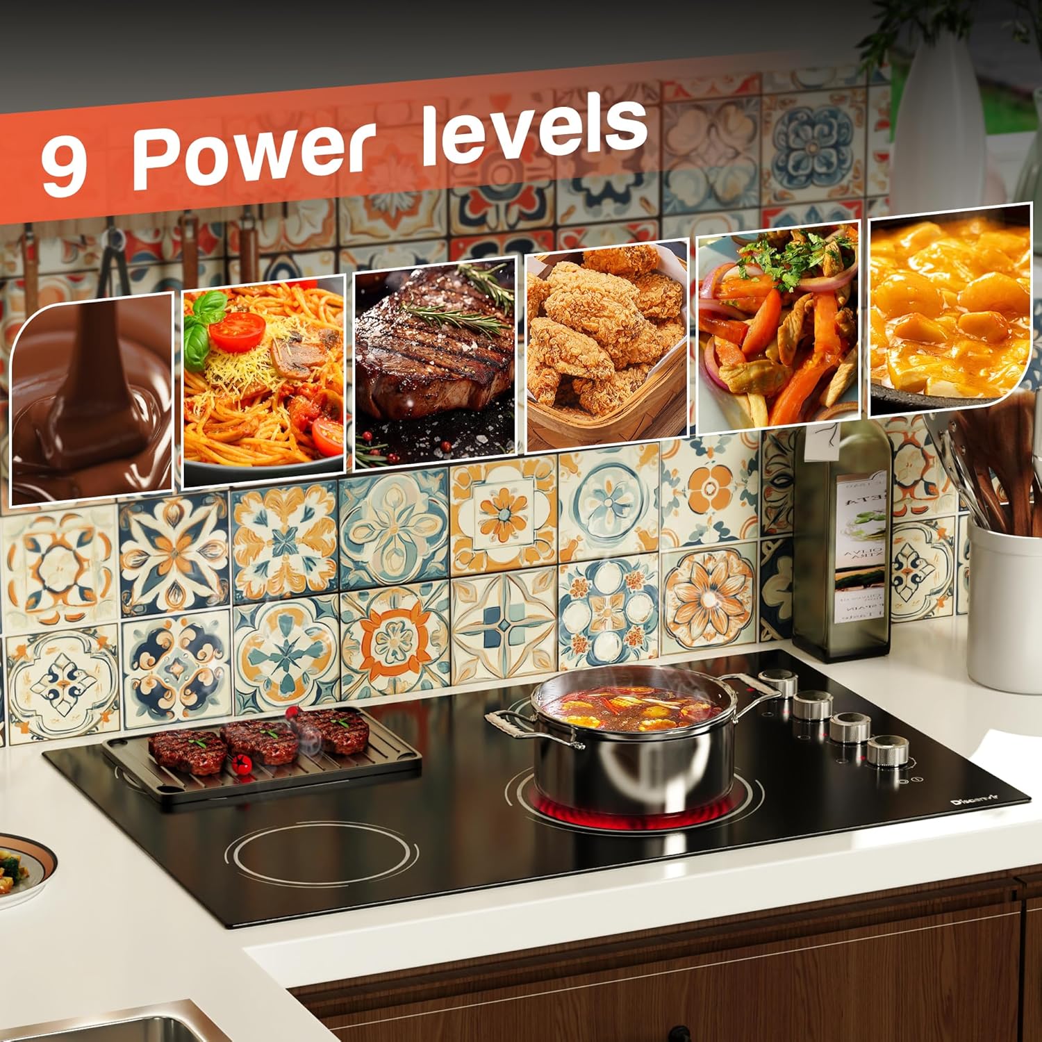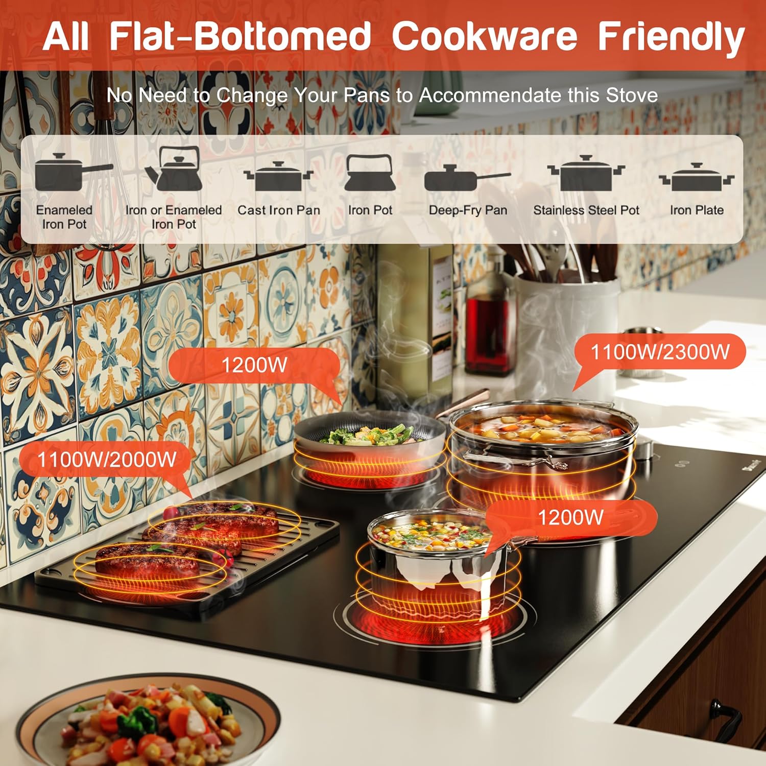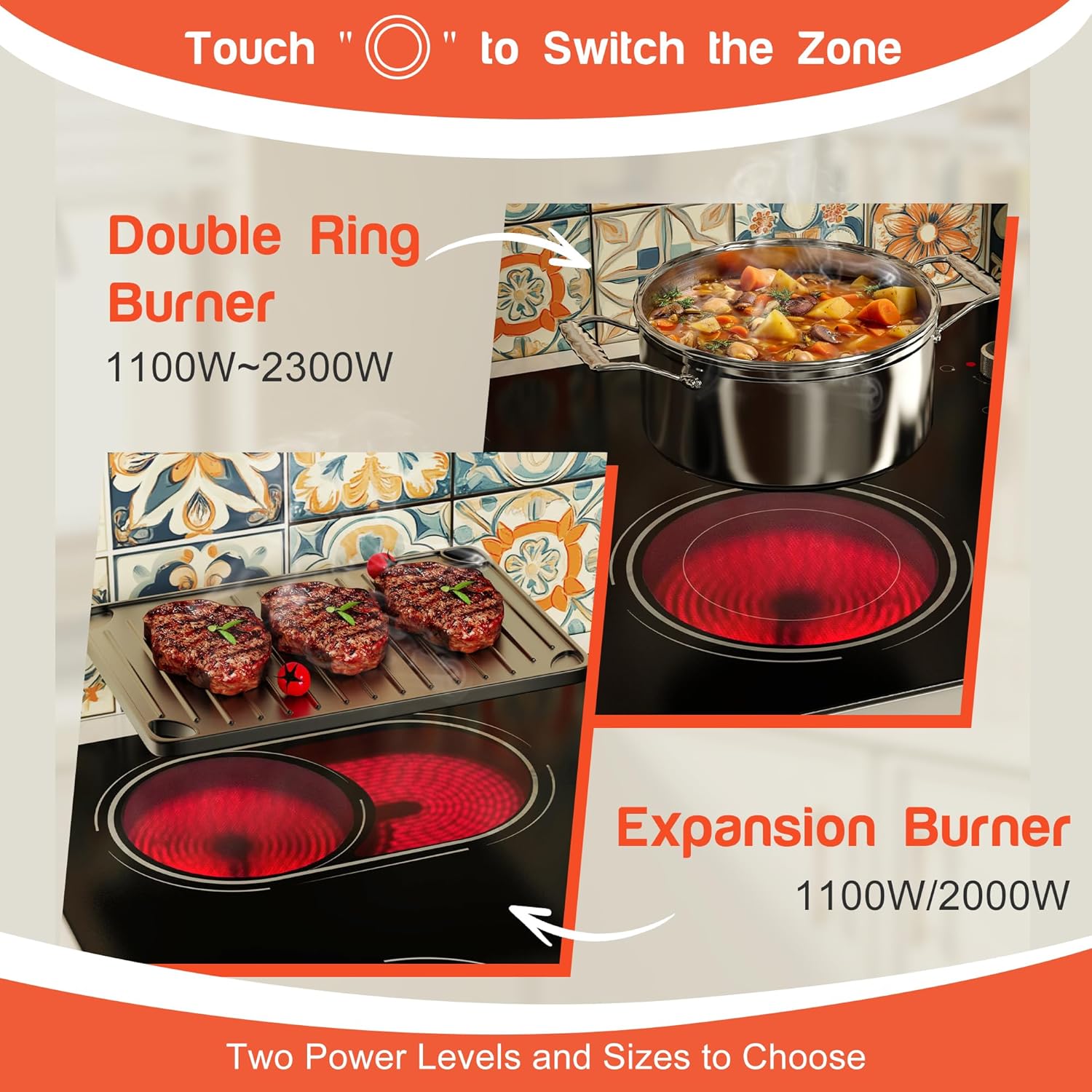 - | Powerful 6700W Heating Power | Disaenvir 30 inch electric cooktop boasts a 4-burner layout with a total power output of 6700 watts(1200W+1200W+2000W+2300W), ensuring efficient and effective cooking. The independent fourth burners provide a choice between 1100 watts and 2300 watts, making it ideal for rapid boiling or gentle melting. This range allows for precise temperature control and caters to various culinary techniques.