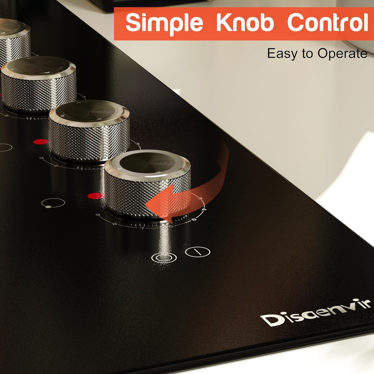 - | Simple and Intuitive Knob Control | Disaenvir 4 burner electric cook top features simple knob controls that are easy to use. Each burner has its own dedicated knob, allowing for individual control over the heat settings. The knobs are designed for a smooth rotation, providing a tactile feedback that ensures the selected heat setting is accurately applied. This straightforward control system makes it easy to adjust the temperature without the need for complex menus or digital interfaces.