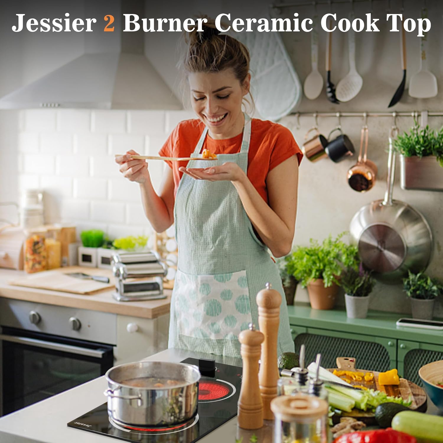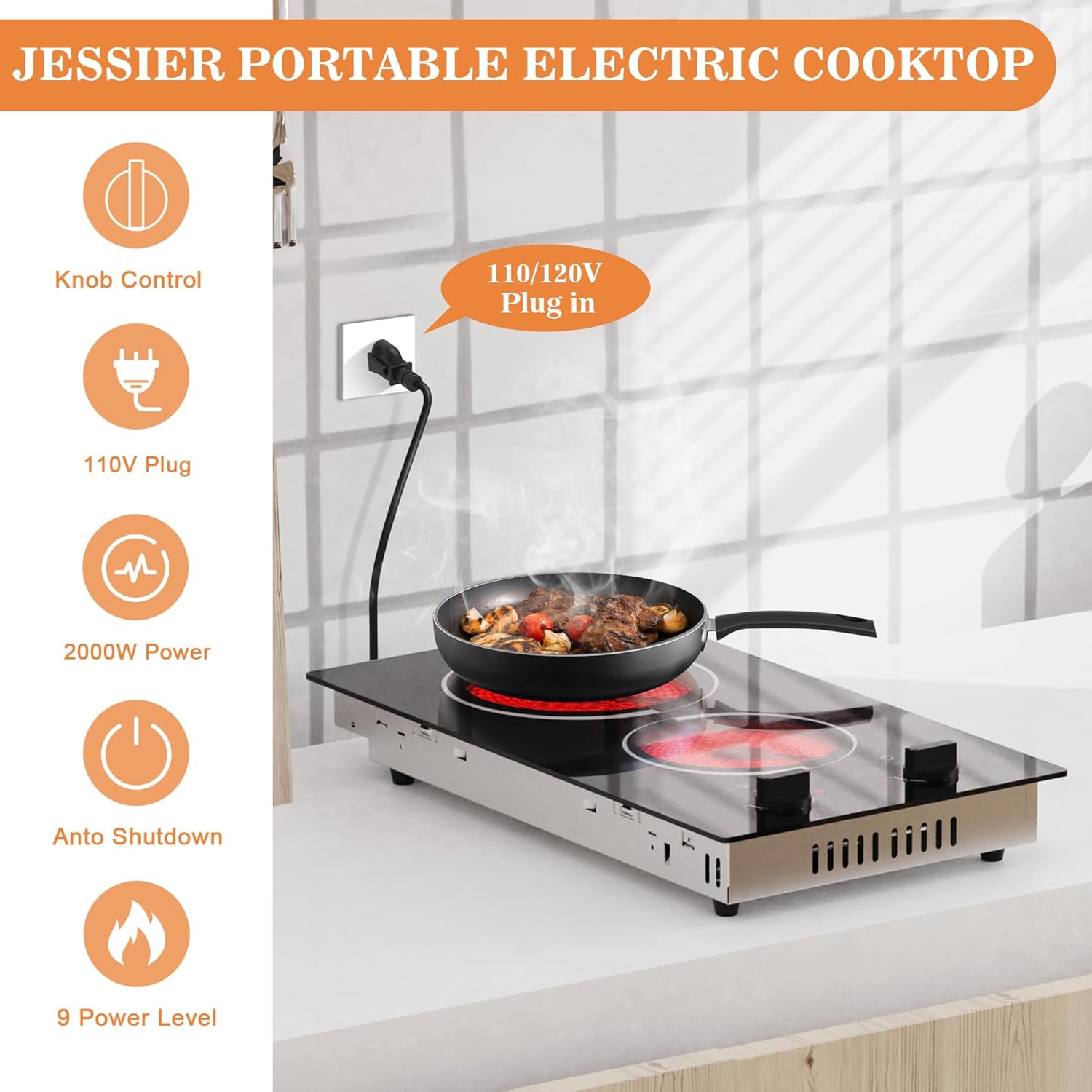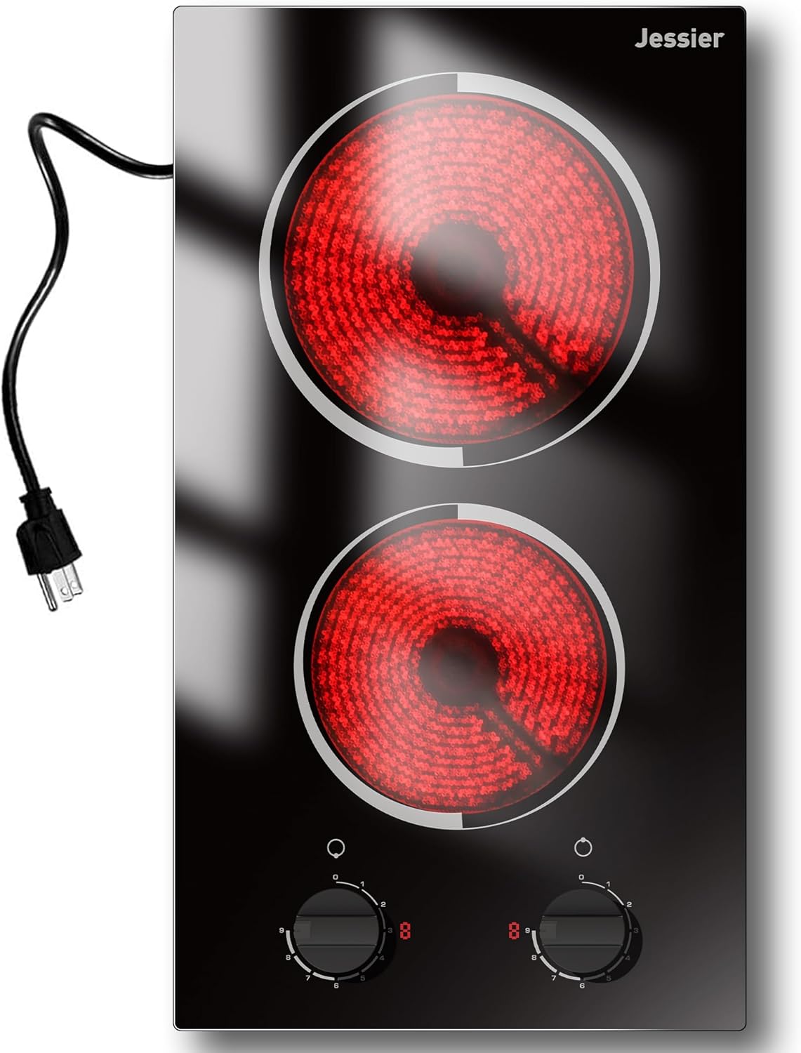 Jessier 2 Burner Electric Cooktop - 12 Inch Plug in Portable 110V Electric Cook Top, Built-in & Countertop Ceramic Stove Top with Knob Control, 9 Power Levels and Overheat Protection