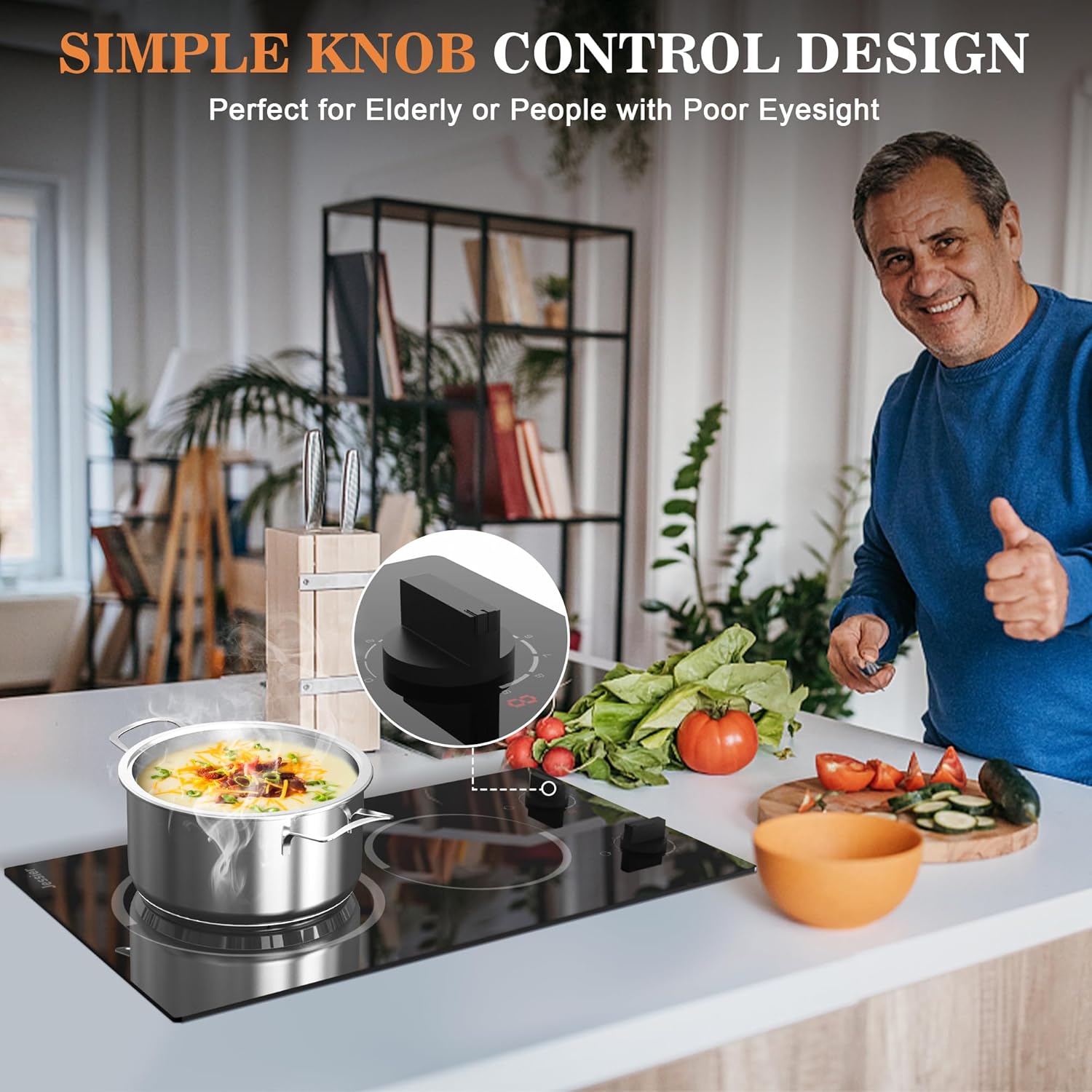 - 【Electric Cooktop with Knob Control】Jessier 110V electric cooktop burner is controlled by two knobs, each controlling a burner. It is very simple to use, and it is easy for elderly and children to learn how to use it. Especially for the elderly, their strength is not good, and the knob type electric stove is more suitable for them than the sensor touch control electric stove. If you don't need too many features and prefer simplicity, you can choose this knob controlled electric stove.