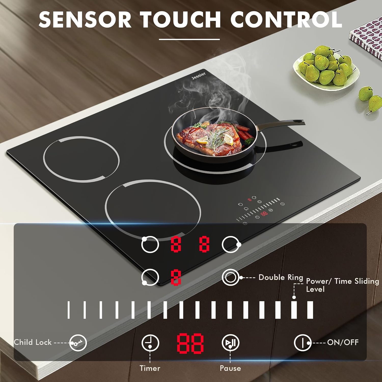 - 【Multifunctional Electric Cooktop】If you don't like those knob model electric cooktop, you can try our sensor touch control electric cootkop, which has more function that help cooking, such as 99-minute timer, auto shutdown, safety lock, high temperature warning, overheat protection, pause function, etc. Jessier 24 inch electric cooktop not only makes your cooking easier but also protects your safety.