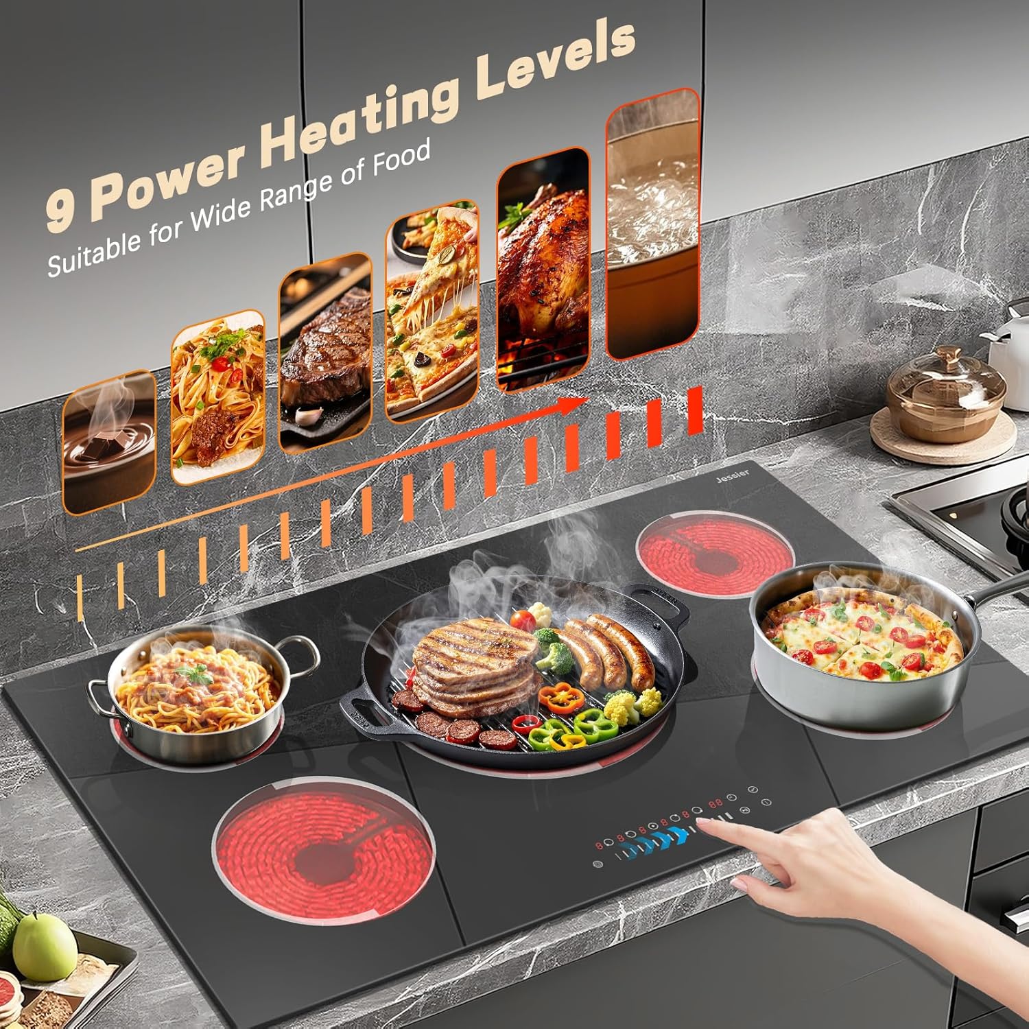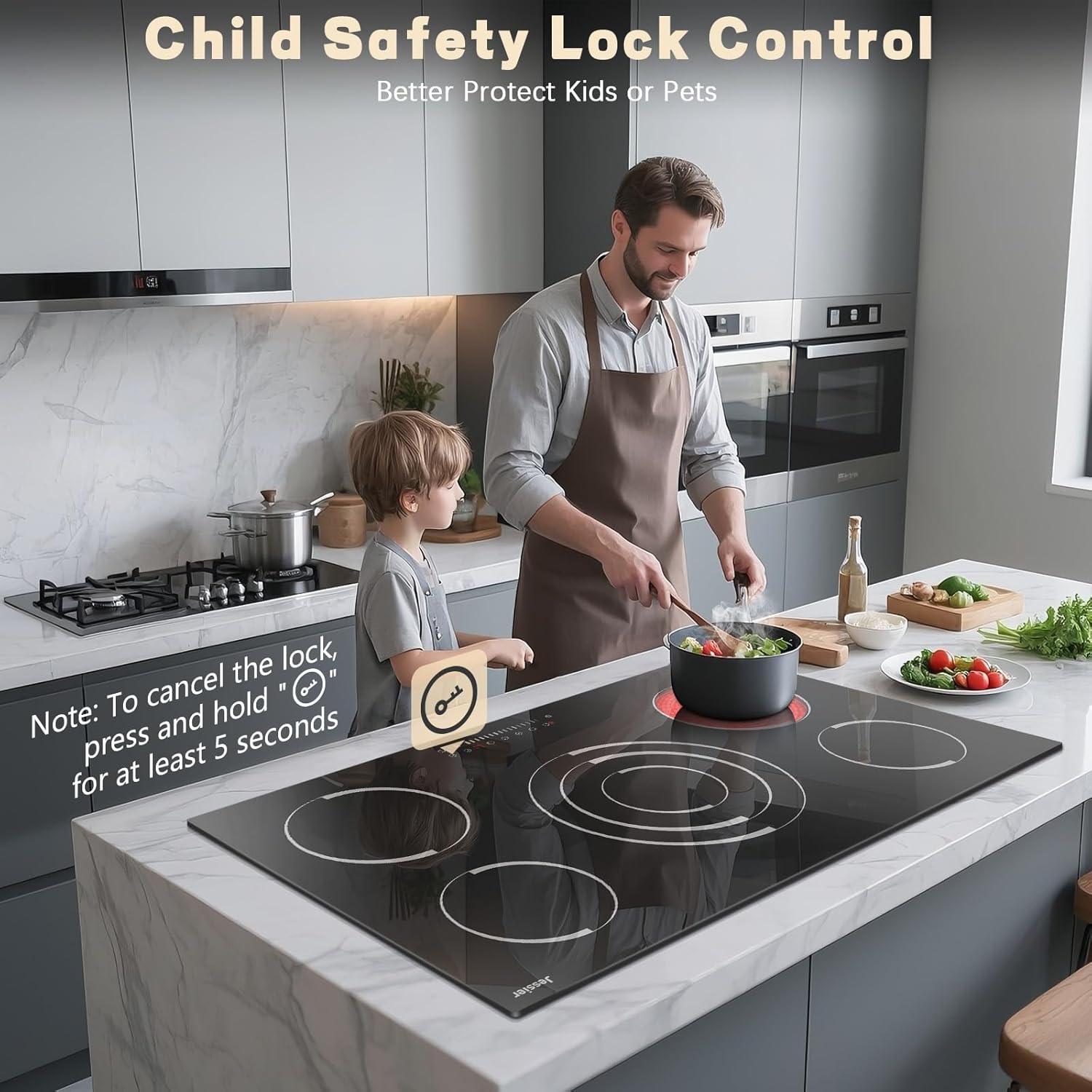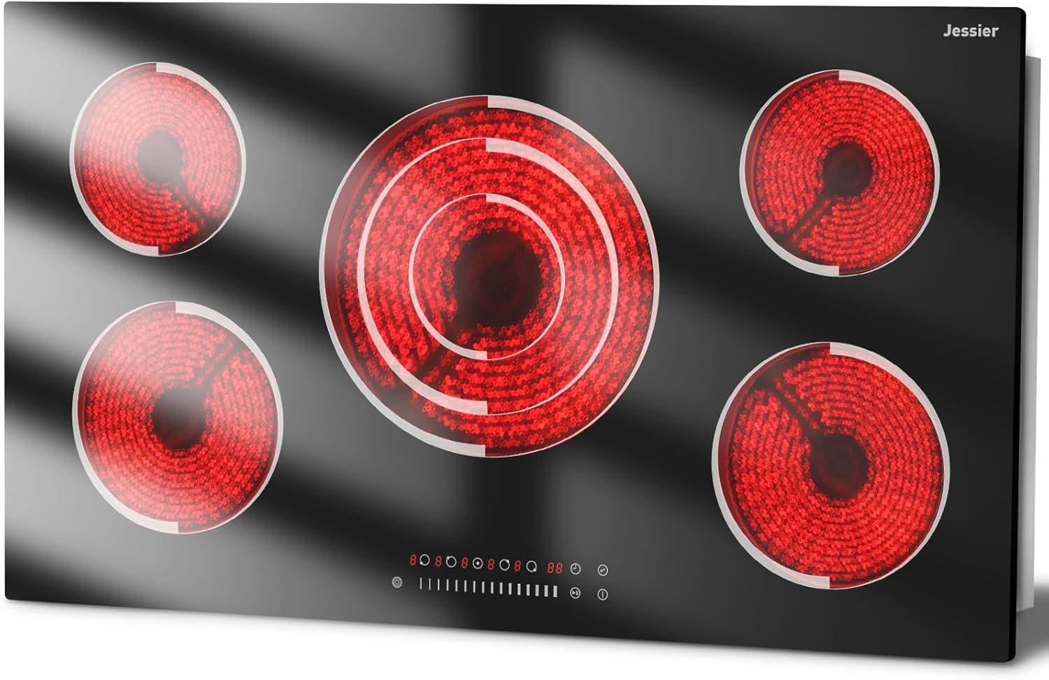 - | User-Friendly Slide-Touch Control | Jessier 5 burner electric cooktop is equipped with a slide-touch control system, offering an intuitive and precise method for adjusting the heat settings. You can simply slide your finger along the touch-sensitive controls to increase or decrease the power output of each burner. This technology eliminates the need for traditional knobs or dials, creating a sleek and modern appearance. Also, the control panel is designed to be easy to clean, as there are no crevices or gaps where food particles can accumulate.