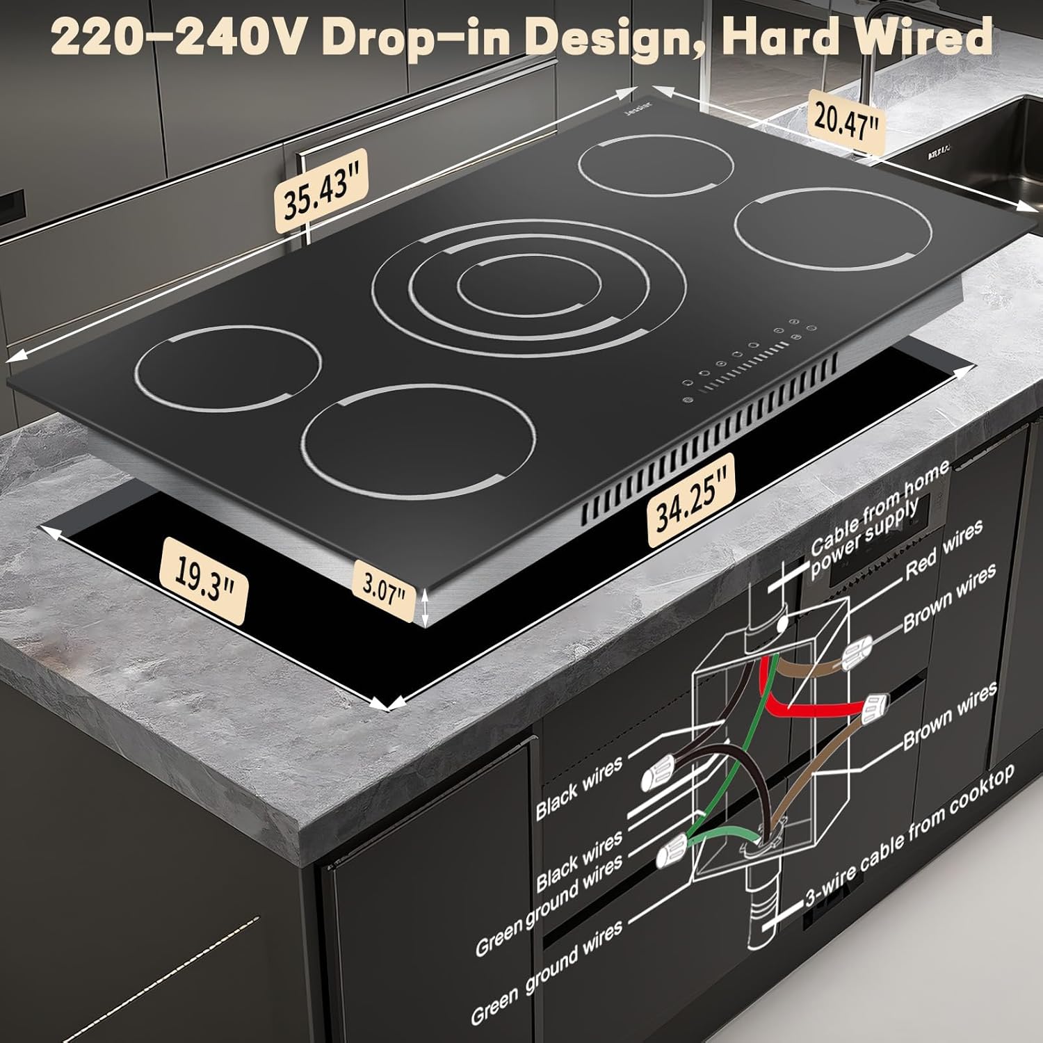 - | 220-240V Drop-In Installation | Note: this 36 inches electric stove is a high power appliance, which is suitable for 220-240v. There is no plug, sp you need to find a qualified person wiring. The glass electric cooktop is built-in design install, please approve the cut-out size is suitable before purchase: Stove top Size:35.43 in(900mm) x 20.47 in(520mm) x 1.73 in(44mm), Cut-out Size:34.25 in(870mm) x 19.3 in(490mm).