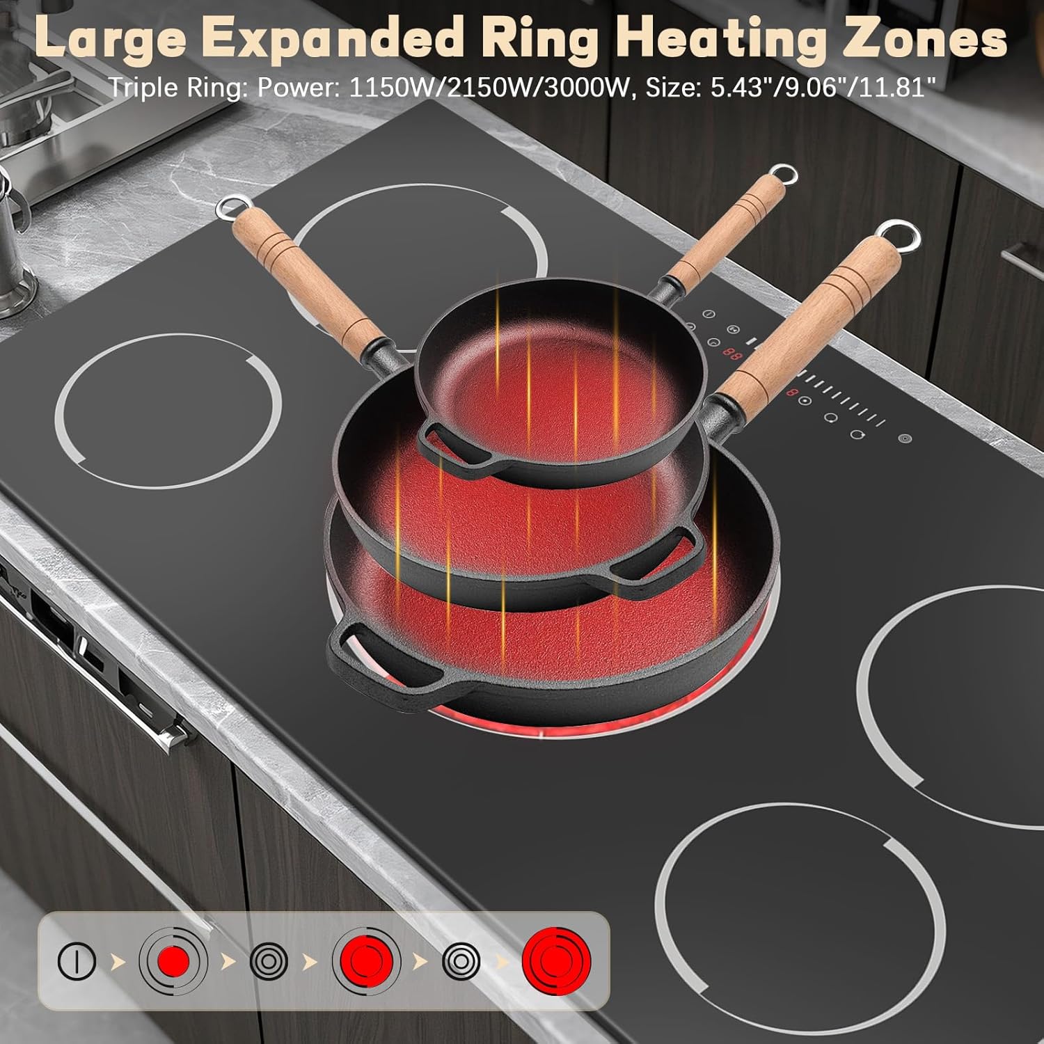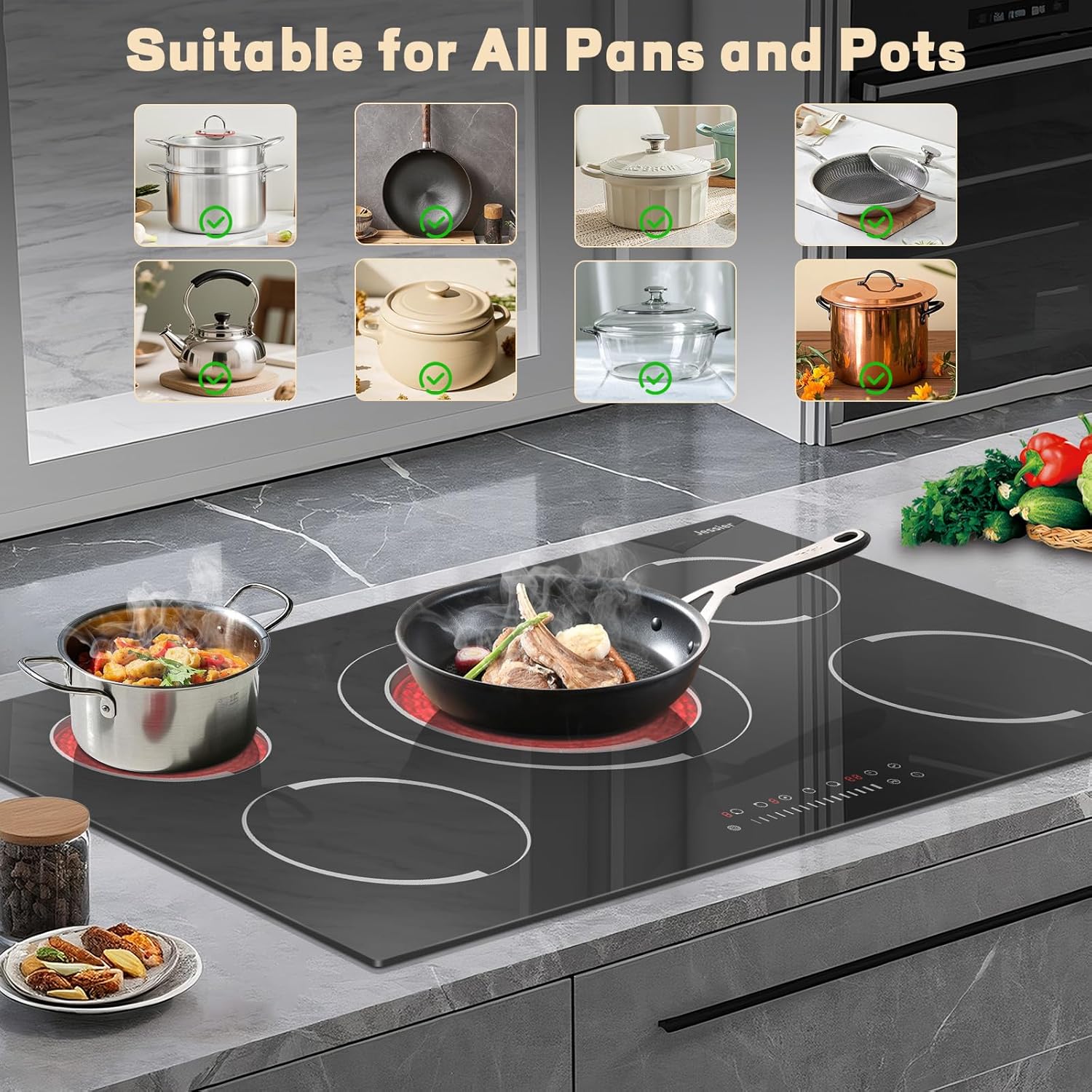 - | Compatibility with All Cookware | You can use any material of pot on this 36 inch electric ceramic cooktop 5 burners , such as iron, stainless steel, copper, ceramics, glass, etc. Unlike induction cooktop, which require the use of an iron pot. Moreover, the electric ceramic stove has no electromagnetic radiation and is harmless to the human body. Note: Plug is NOT included in the package. NOTE: for how to do the wiring, please refer to the wiring diagram on the instruction manual you received.