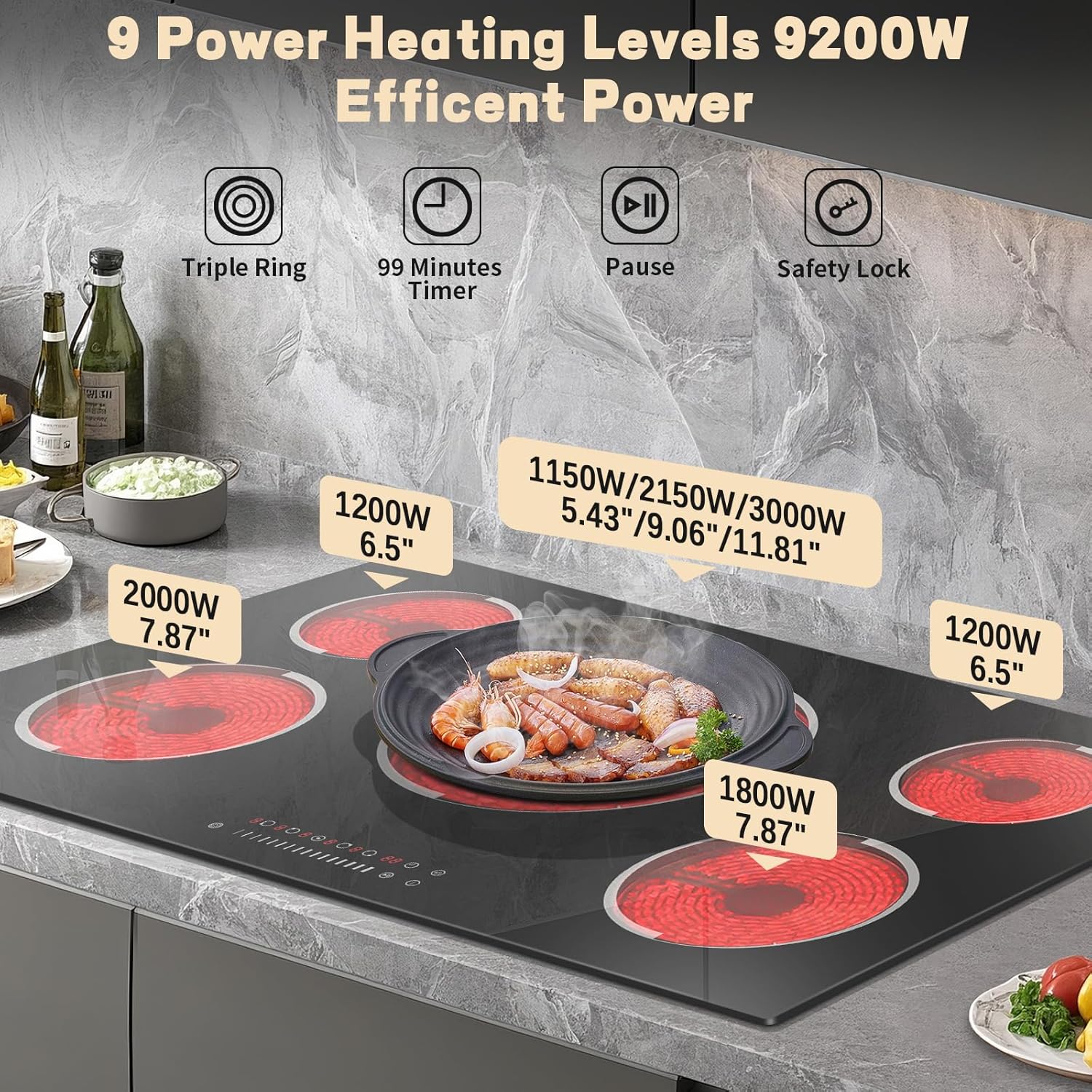 Jessier Electric Cooktop 36 Inch - Built-in 5 Burner Electric Stove 9200W High Power, 36" Cooktop Stove with Metal Frame Protection, Slide Touch, Timer, Safety Lock, 220-240V Hard Wired (No Plug)