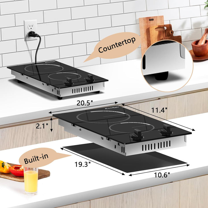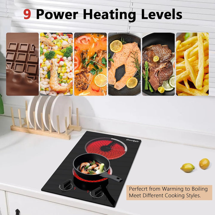 Cooksir 2 Burner Electric Cooktop - 110v Countertop and Built-in Electric Stove 2000W, 12 Inch Ceramic Stove with Residual Heat Indicator, Over-Temperature Protection, Knob Control, 110-120V Plug in