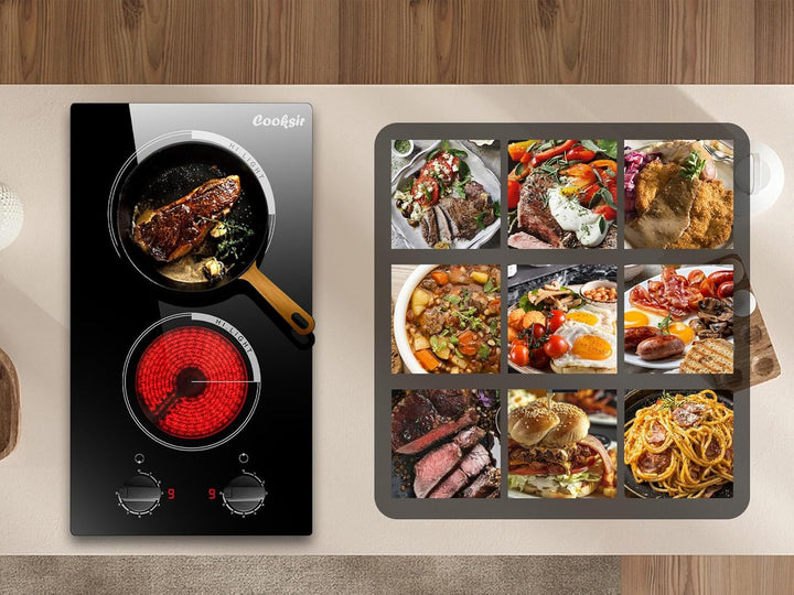 - 【2 Burner Cooktop Suitable for Various Cookwares】Electric ceramic cooktop 2 burner is compatible with all kinds of pots and pans, such as iron, stainless steel, ceramic, glass, casserole. Unlike induction cooktop, it is necessary to choose the magnetic cooker. Cooksir electric stovetop has 2 powerful burners(1400W + 600W), which can cook different delicious dishes at the same time. Hope it can become a good helper in your kitchen.